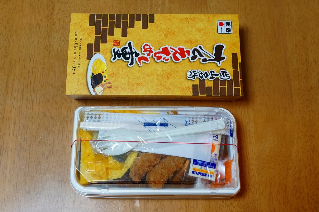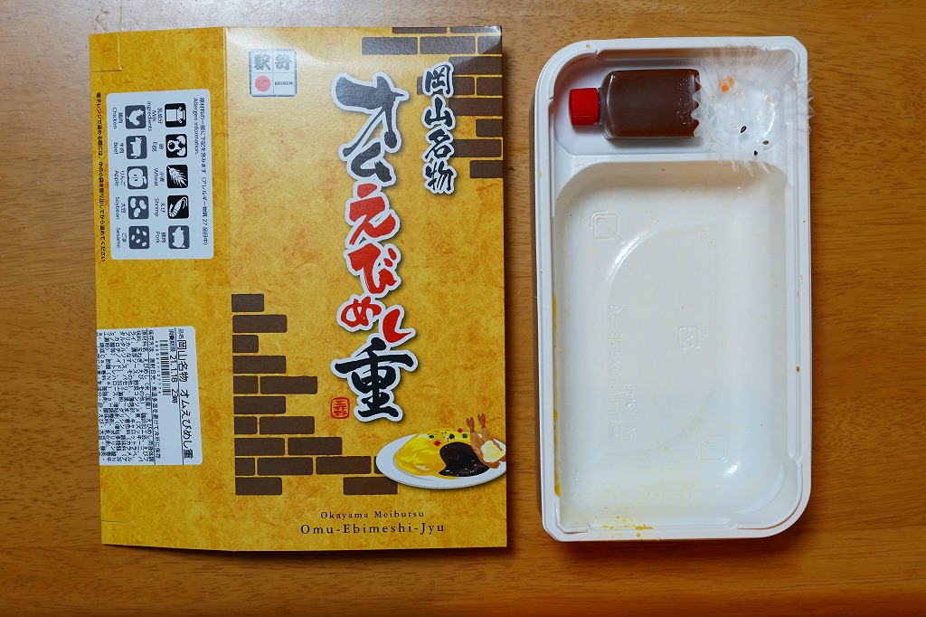 2020(令和2)年9月までに発売か。駅弁の名前のとおり、岡山のえびめしにオムレツを載せたもの。デミグラスソースで黒く染まるエビの混ぜ御飯に、パプリカやズッキーニなどを混ぜたオムレツを載せ、エビフライ2本も載せ、ニンジン炒めとソースを添える。岡山駅の駅弁で手を変え品を変え何度か食べた気がする、期待どおりの味。1年間ほどの販売か。