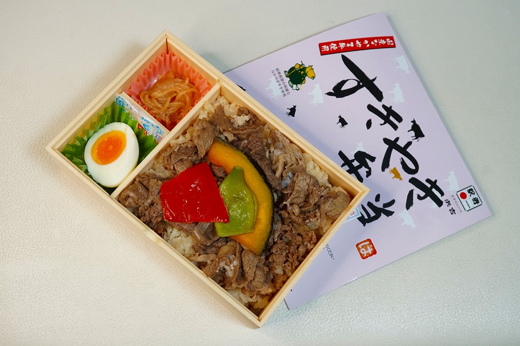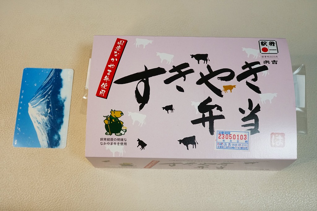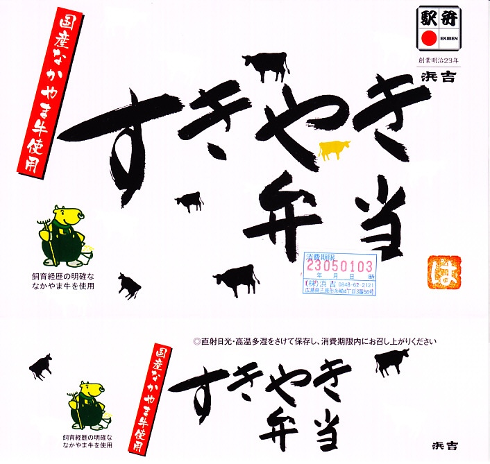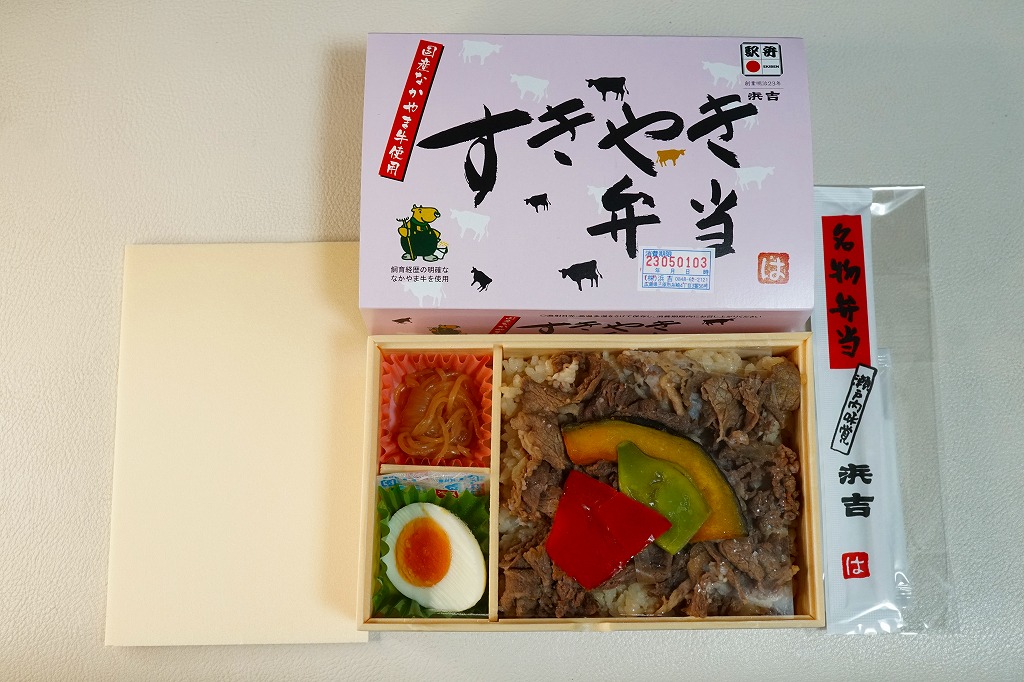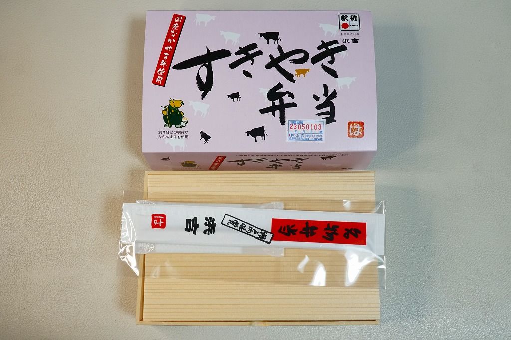 駅弁の名前は「国産すきやき弁当」とも。2016年までに岡山駅で発売か。長方形の容器に味付ご飯を詰め、国産なかやま牛の、広島県福山の畜産業者のブランド牛「なかやま牛」のすき焼きで覆い、かぼちゃ、いんげん、パプリカの揚げ野菜で彩り、ゆで卵と糸こんにゃくを添える。味付けの淡い、すきやきの味。一緒に買った同じ調製元の福山駅弁「春彩すき焼き弁当」より安いのに、彩りも肉の分量も風味も上回るように感じた、今の世では安めでうまいと思う牛肉駅弁。知名度はほぼ無い。価格は2016年時点で980円、2023年時点で1,030円、同年5月から1,150円、2025年時点で1,200円。