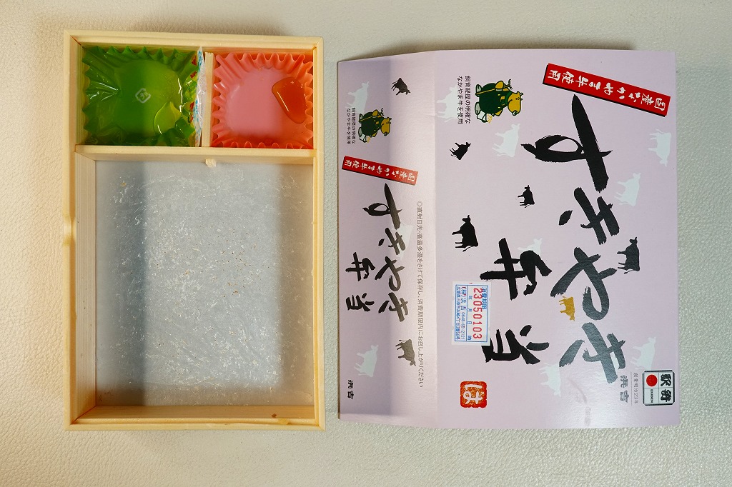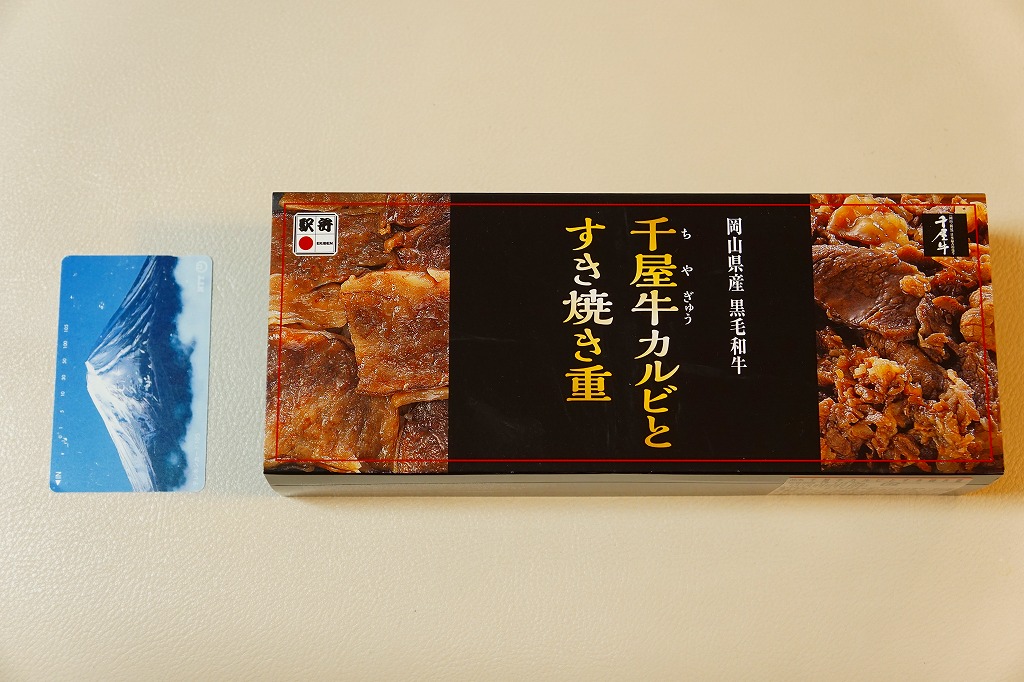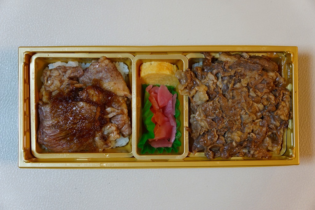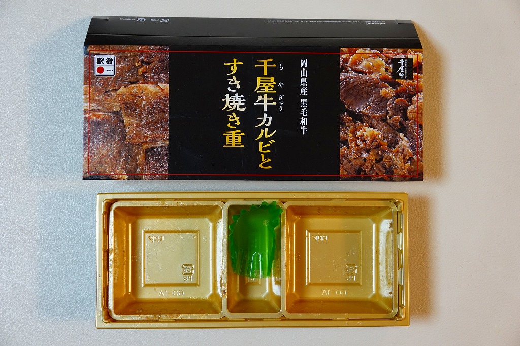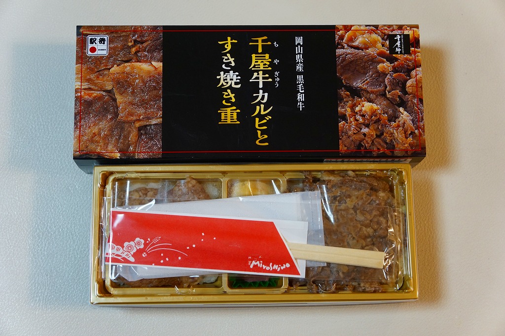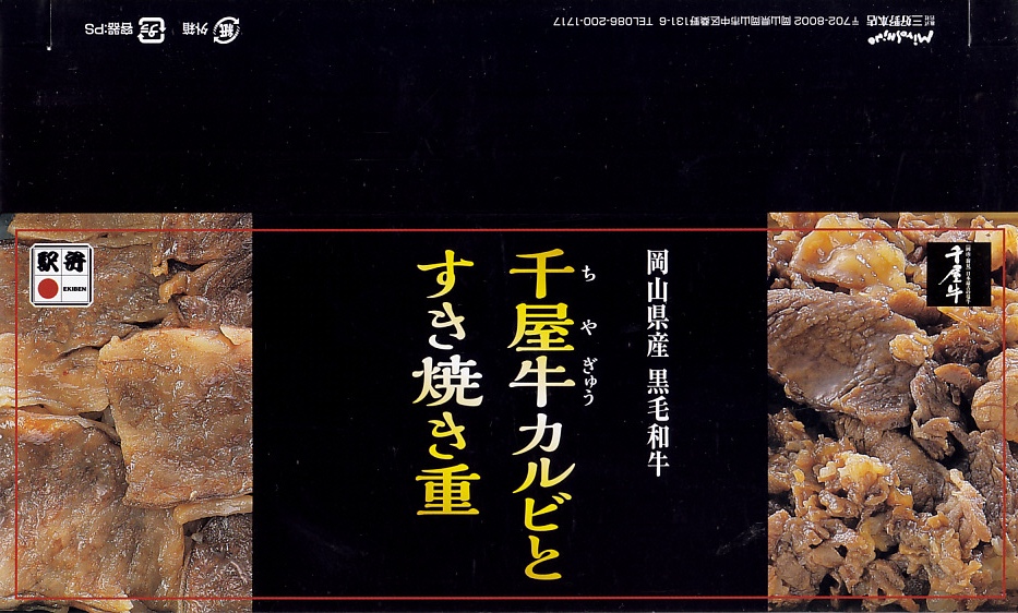 2017(平成29)年1月の京王百貨店の駅弁大会で輸送販売。2016〜2017年の駅弁大会シーズンに売られた商品と考えられるが、他で売られたという情報が得られない。駅弁の名前のとおり、パッケージの写真のとおり、千屋牛(ちやぎゅう)のカルビ丼とすき焼き丼が、小さな正方形のトレーにひとつずつ収まり、その間に玉子焼と大根桜漬のトレーを収める。輸送の冷たさか、タレの量や味なのか、東と西の味覚の違いか、肉の量や質あるいは丼として、1,780円の価格が感じられるものがあったかどうか。