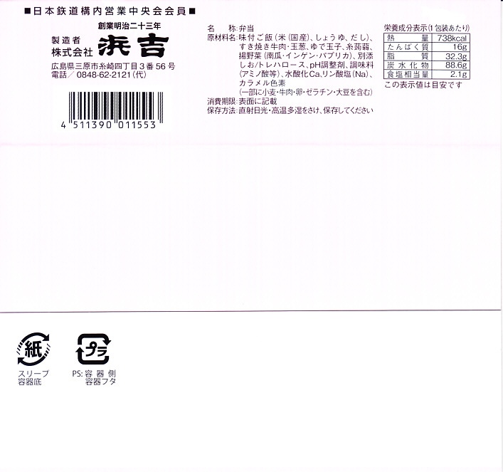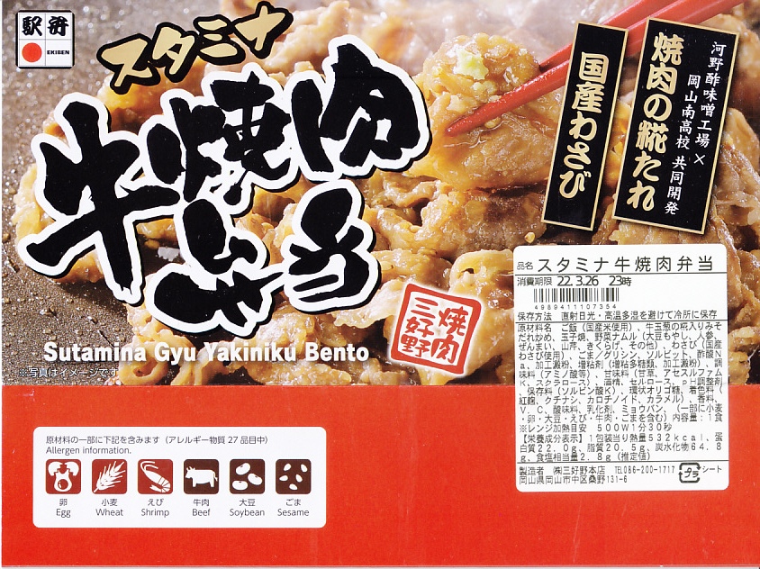 2020(令和2)年の春までに発売か。白飯を牛肉とタマネギの炒め物で覆い、白ごまを振り、ナムルと玉子焼を添える。河野酢味噌工場と岡山南高校で共同開発したという焼肉の糀たれと国産わさびを使った、韓国風焼肉弁当。岡山駅でも全国的にも、駅弁が千円では買えなくなりつつ世の中で、値段も分量も、駅で買って列車内などで食べるのならこれくらいがよいと思う。2022年7月限りで終売。