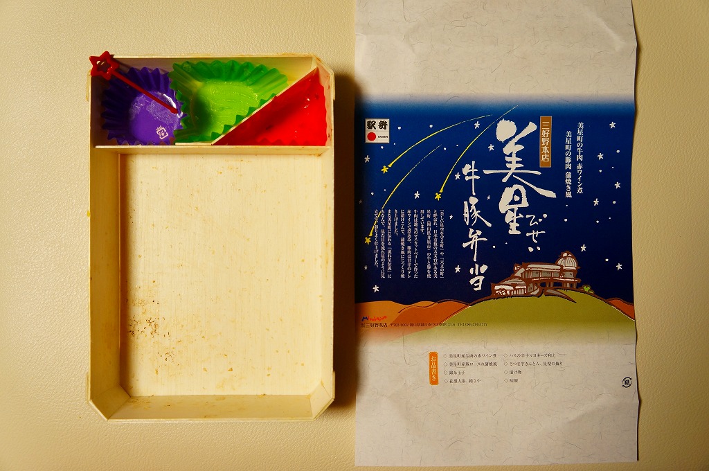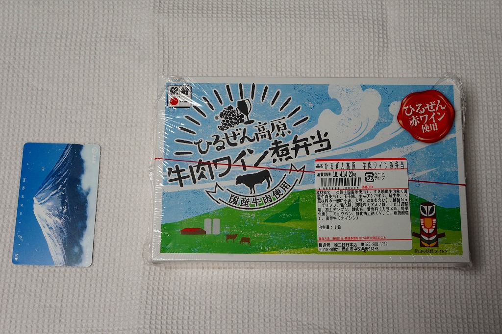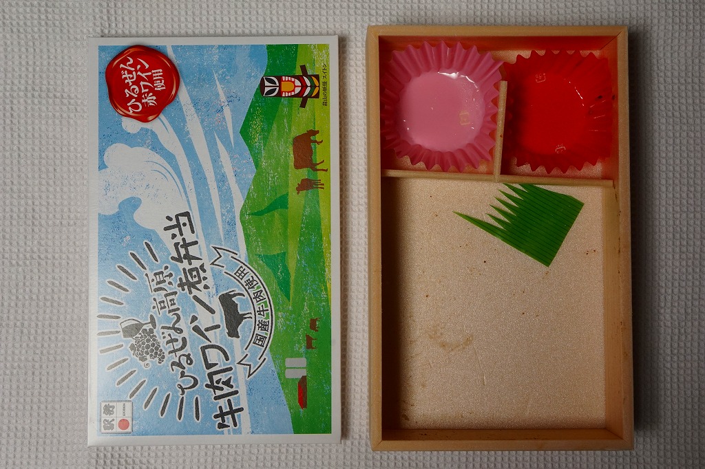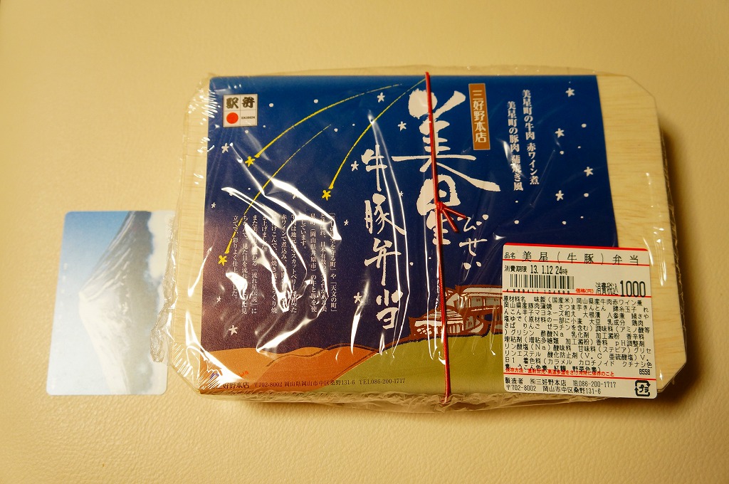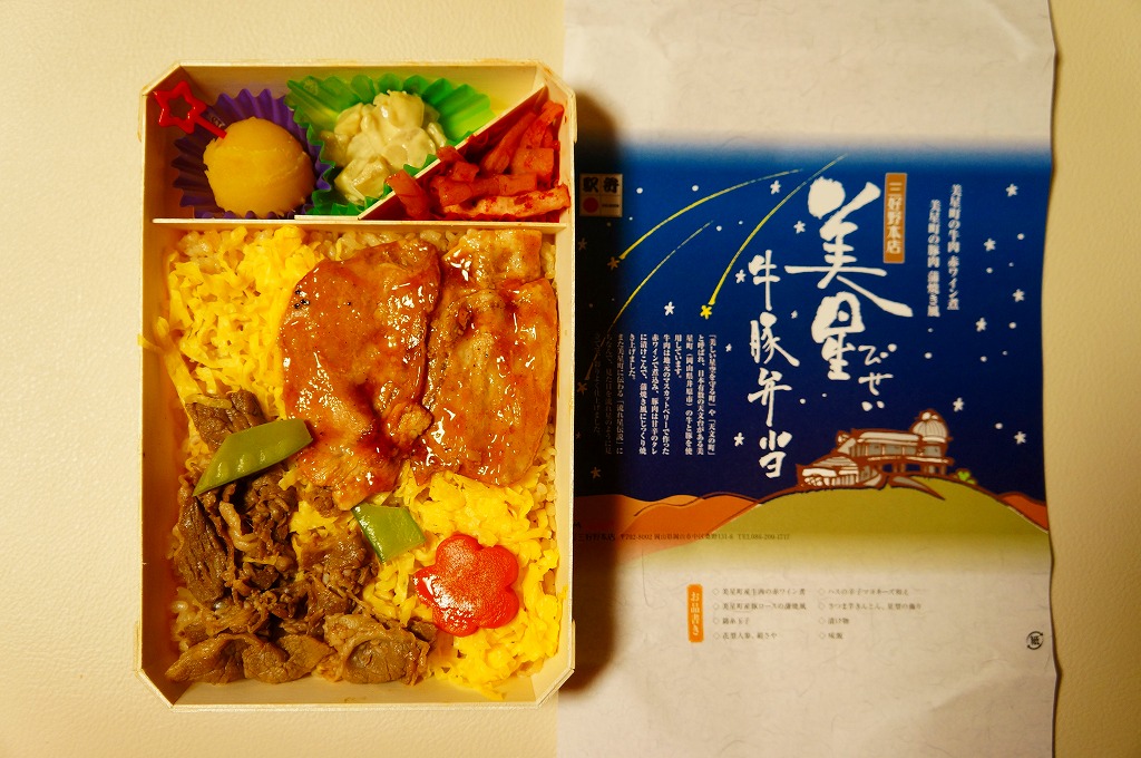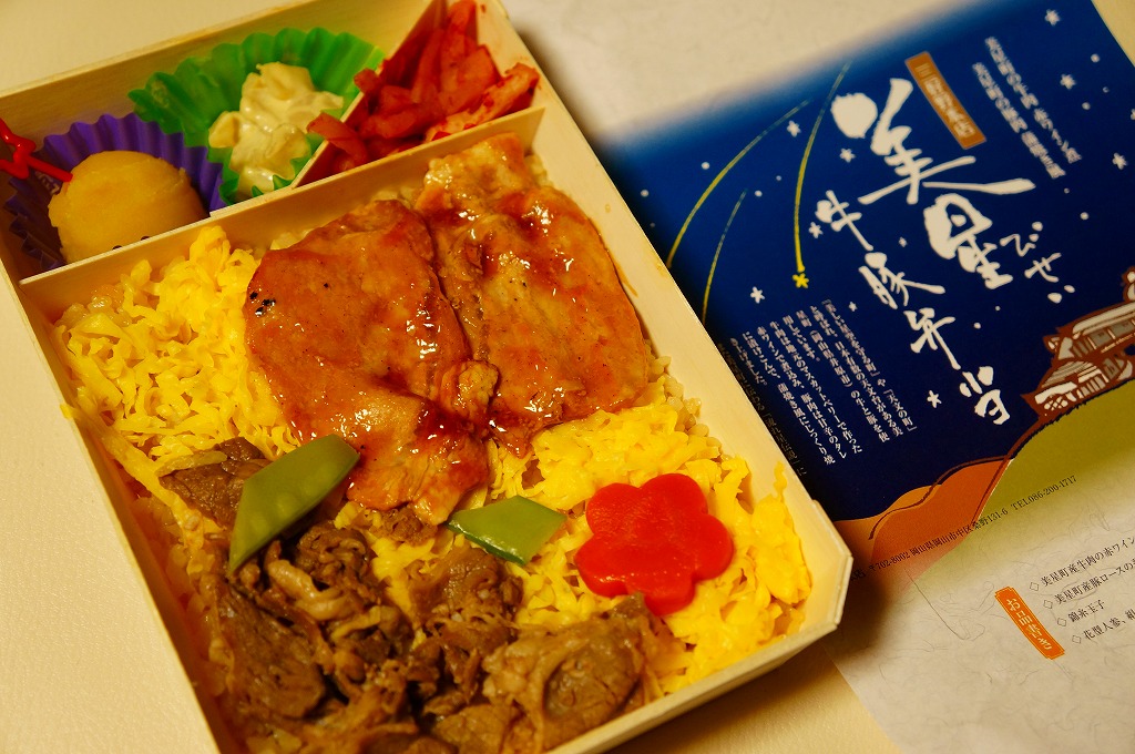 2012(平成24)年11月1日の発売。薄い木でできたエコな容器に味飯を詰め、錦糸卵とともに美星町の牛肉の赤ワイン煮と豚肉の蒲焼きを貼り付け、レンコンの辛子マヨネーズ和え、大根漬、サツマイモきんとんなどを添えるもの。肉はいずれもとてもしっかりした歯応えで、分量の割に飯が進む気がした。価格は2013年の購入時で1,000円、2014年時点で1,100円。2014年までの販売か。