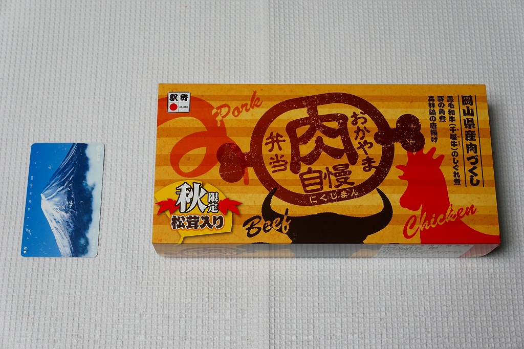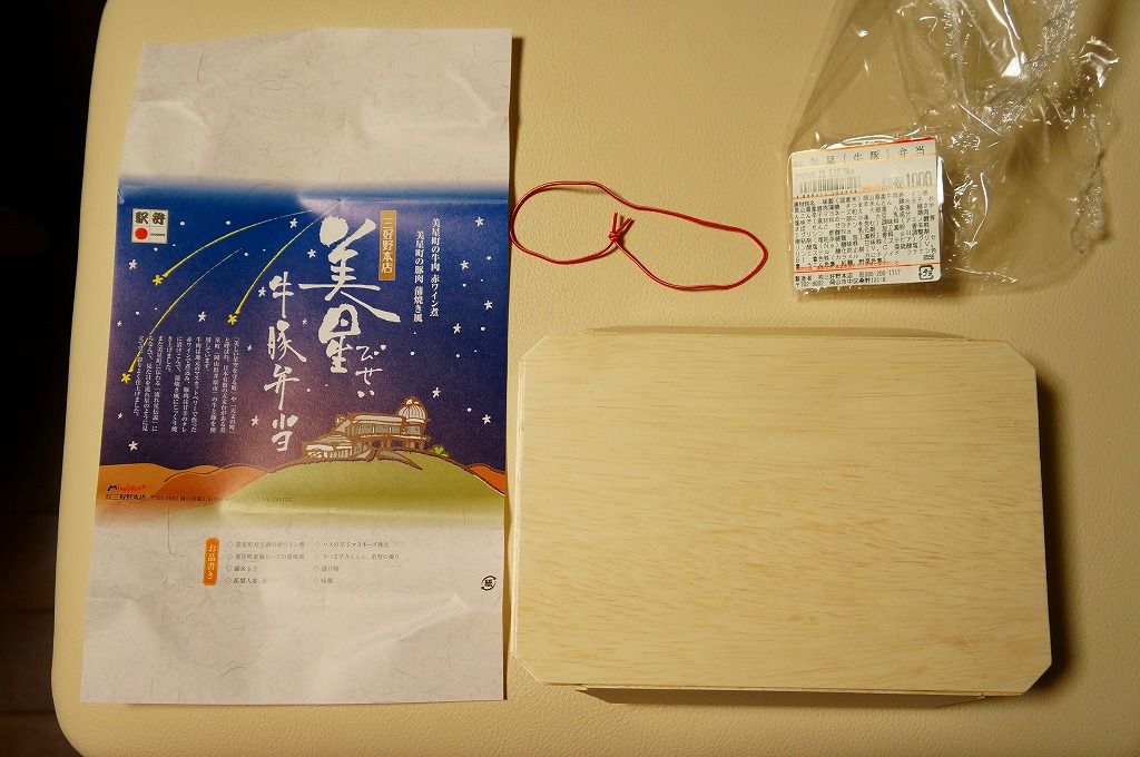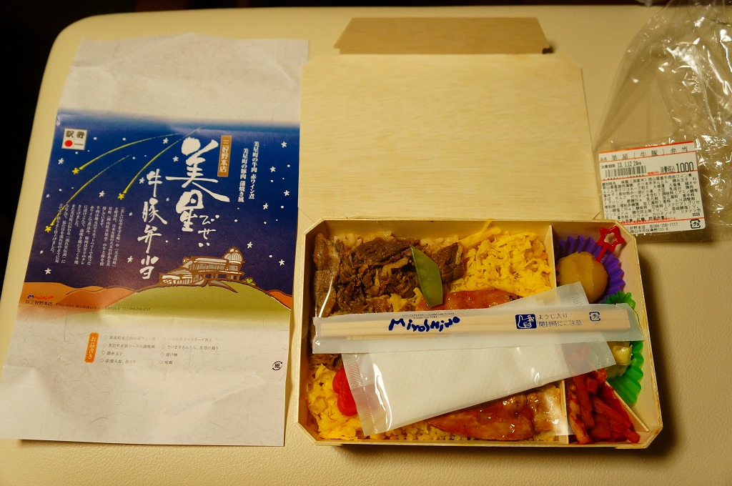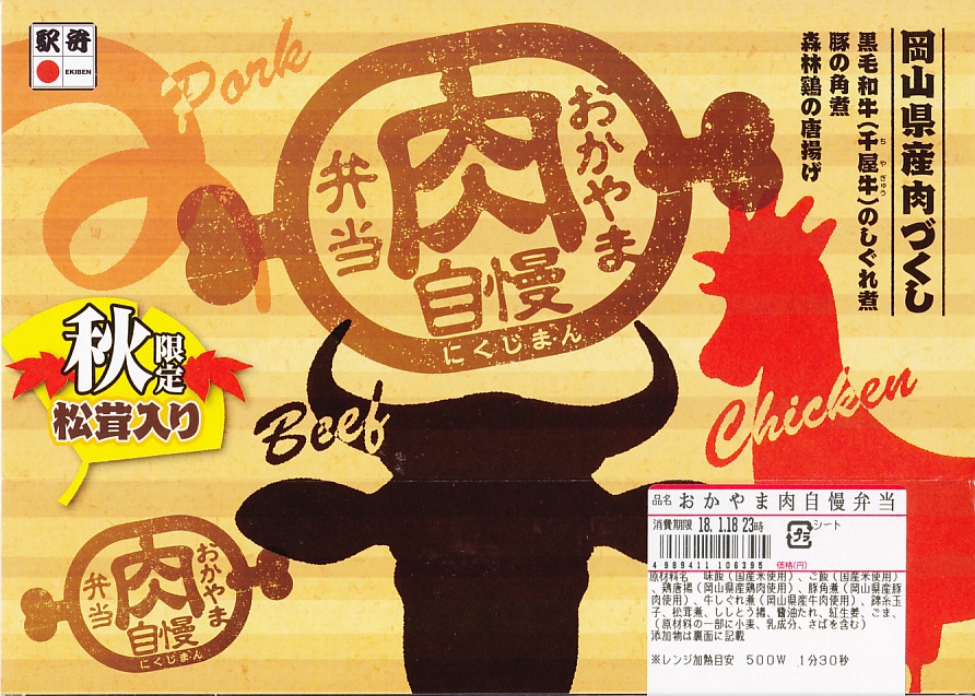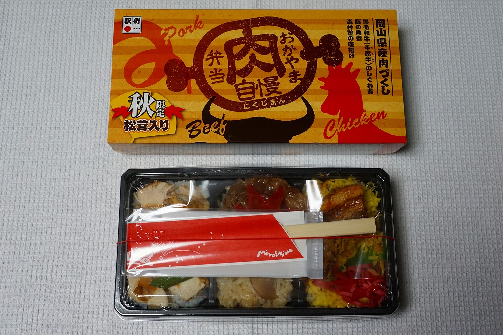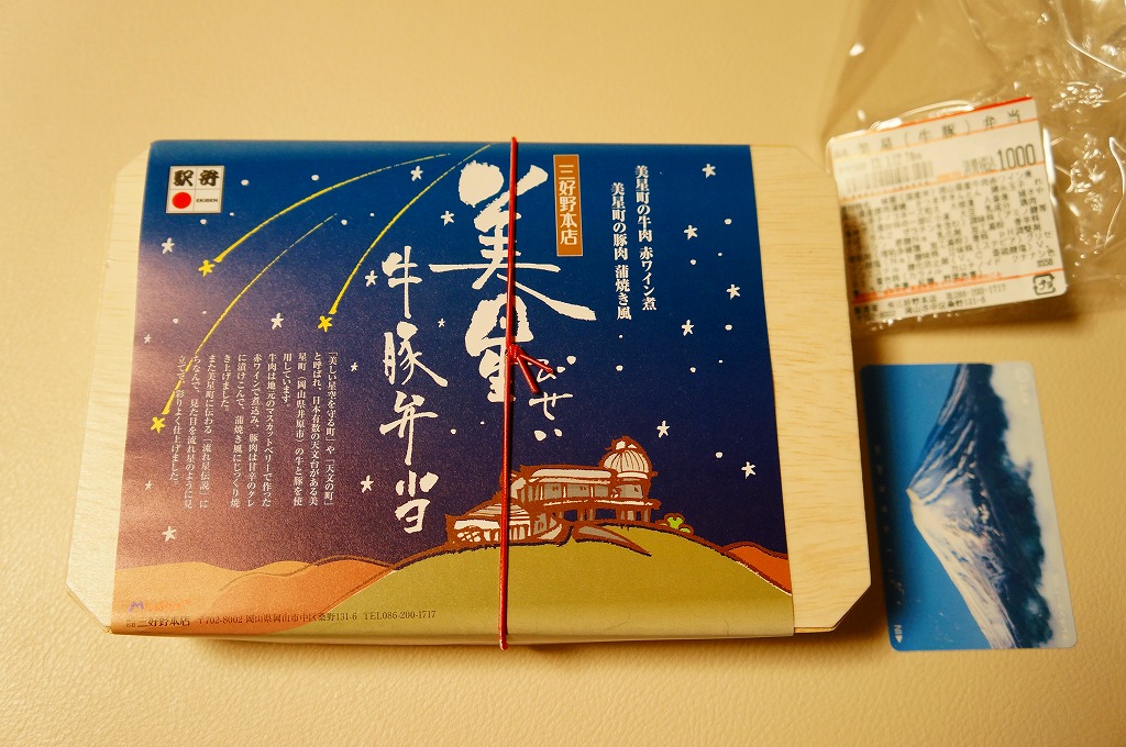 2012(平成24)年11月1日の発売。薄い木でできたエコな容器に味飯を詰め、錦糸卵とともに美星町の牛肉の赤ワイン煮と豚肉の蒲焼きを貼り付け、レンコンの辛子マヨネーズ和え、大根漬、サツマイモきんとんなどを添えるもの。肉はいずれもとてもしっかりした歯応えで、分量の割に飯が進む気がした。価格は2013年の購入時で1,000円、2014年時点で1,100円。2014年までの販売か。
