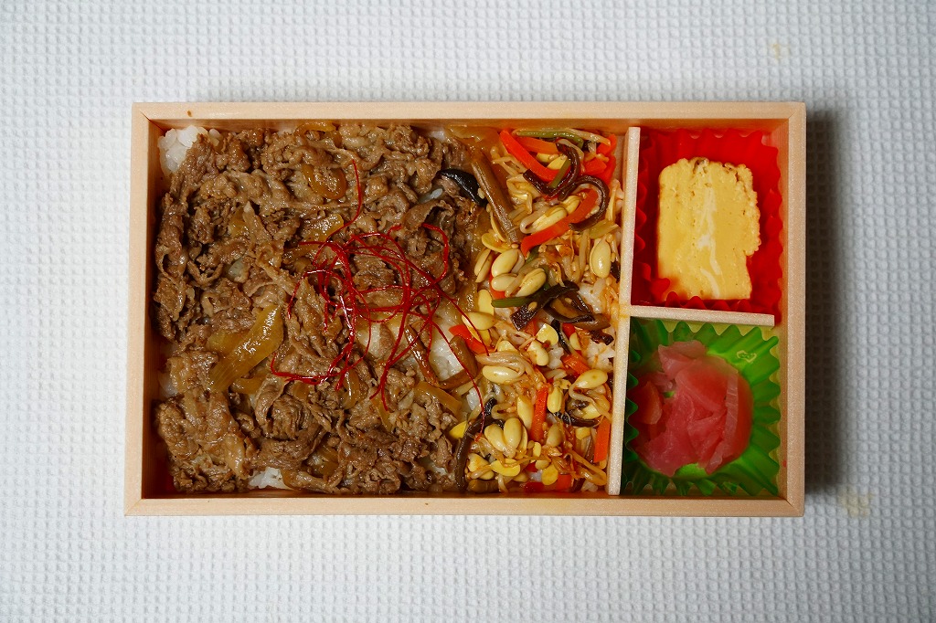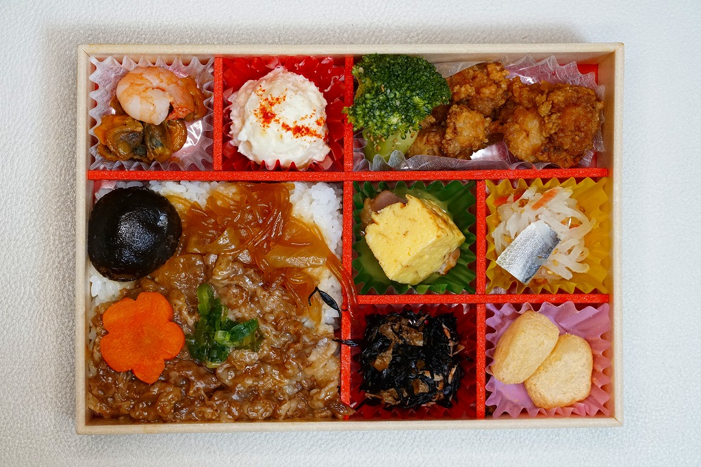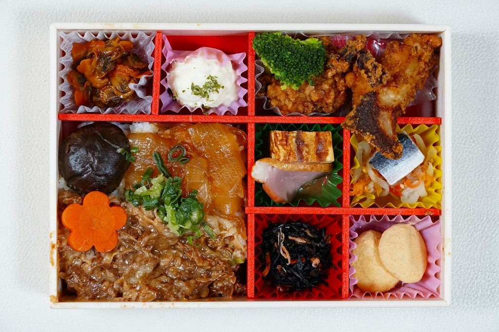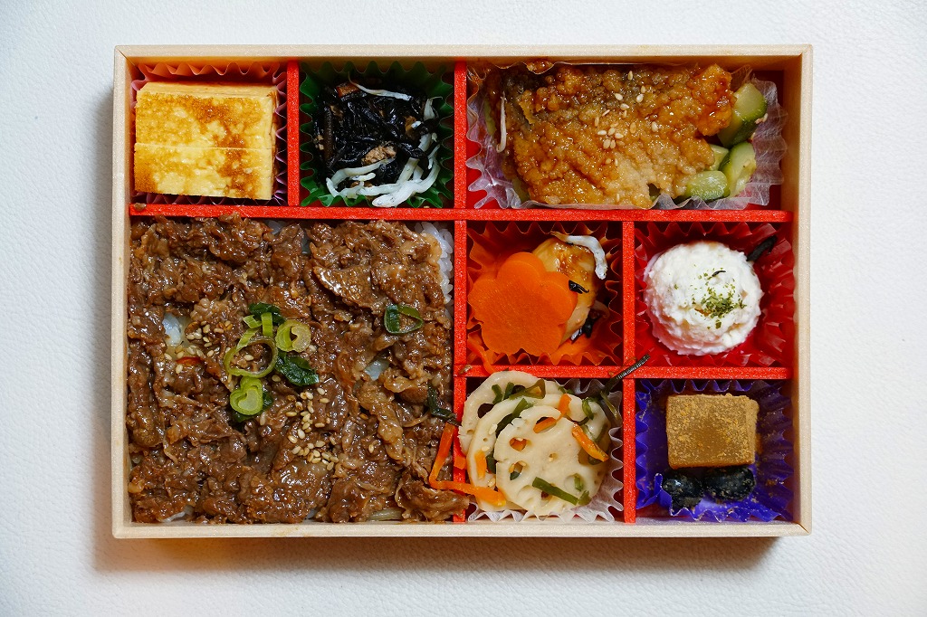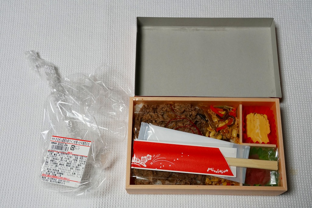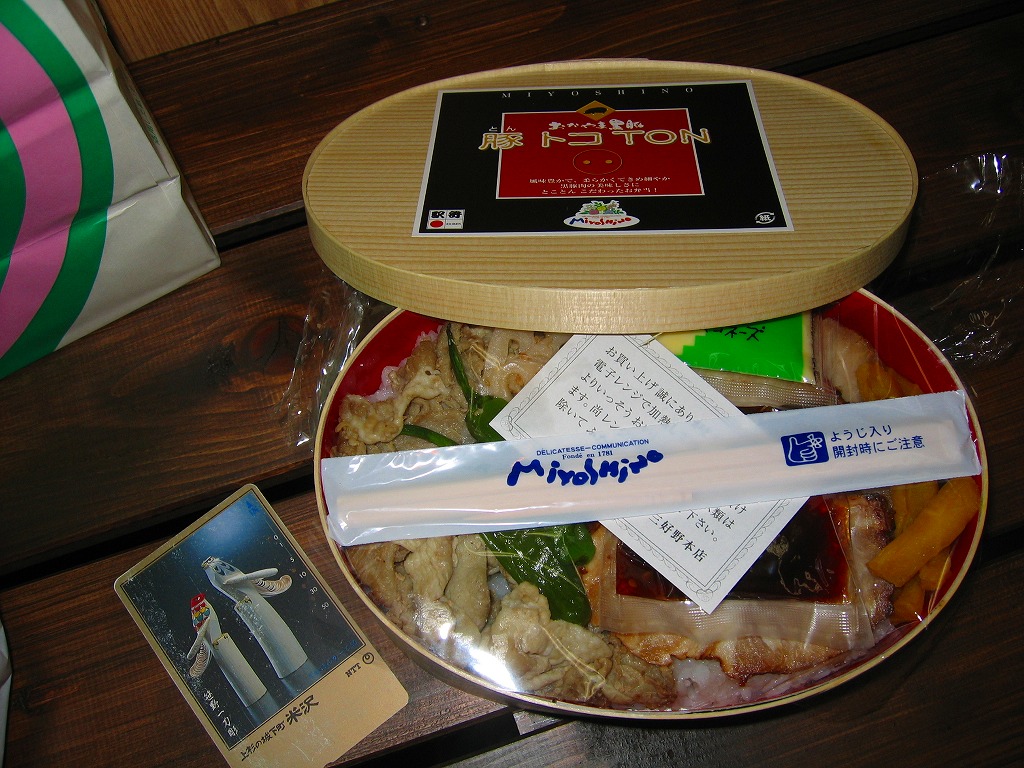 2012(平成24)年11月1日の発売。薄い木でできたエコな容器に味飯を詰め、錦糸卵とともに美星町の牛肉の赤ワイン煮と豚肉の蒲焼きを貼り付け、レンコンの辛子マヨネーズ和え、大根漬、サツマイモきんとんなどを添えるもの。肉はいずれもとてもしっかりした歯応えで、分量の割に飯が進む気がした。価格は2013年の購入時で1,000円、2014年時点で1,100円。2014年までの販売か。