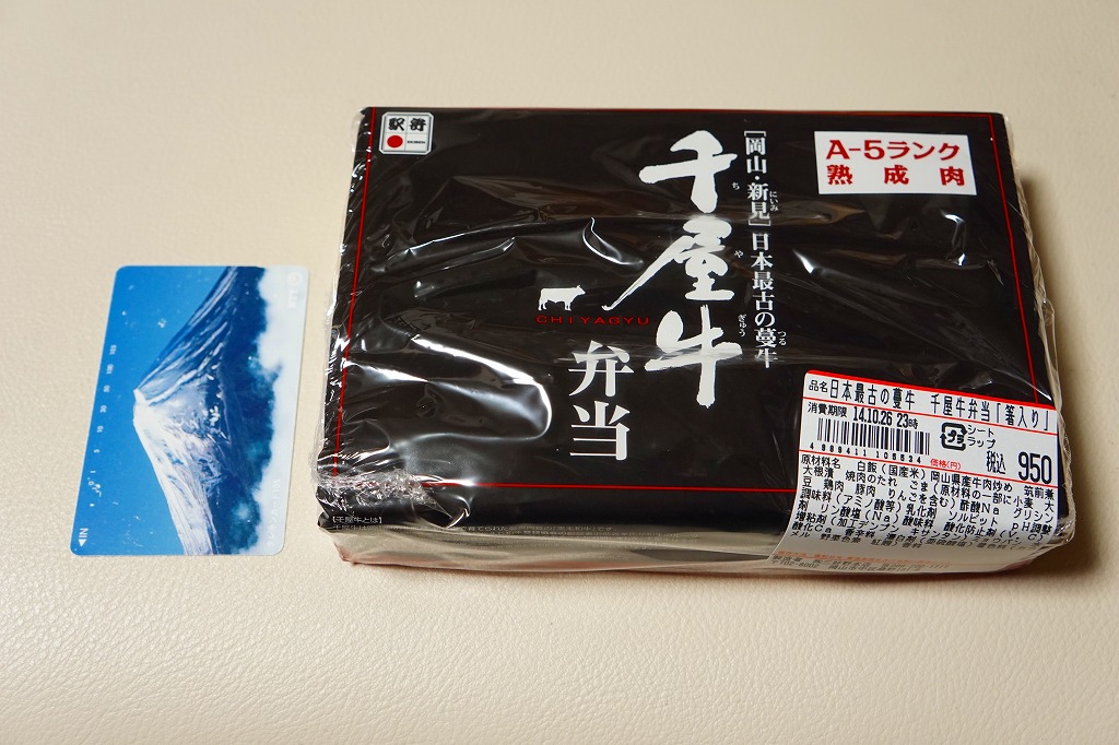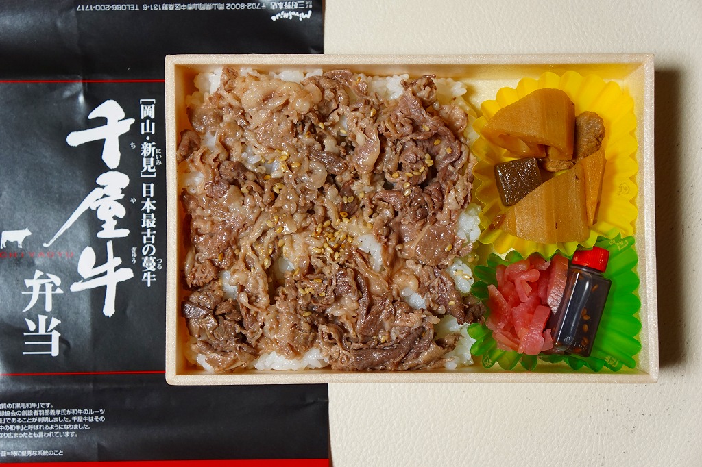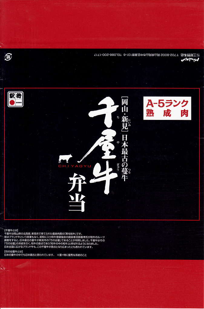 2014(平成26)年9月1日に発売。JR西日本岡山支社とジェイアールサービスネット岡山と三好野本店との連携による、新見市の地域の魅力を活かした駅弁。白飯を牛肉炒めで覆い、筑前煮と大根漬を添える。黒い掛紙にいくつかの宣伝文があるが、普通の内容の牛肉駅弁。小柄で少量なので価格も控えめ。1年間ほどの販売か。