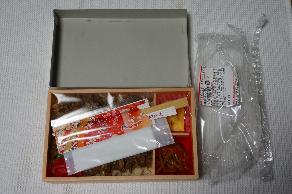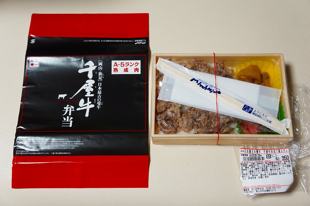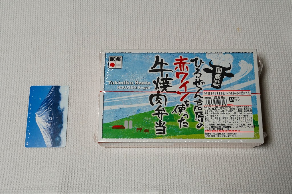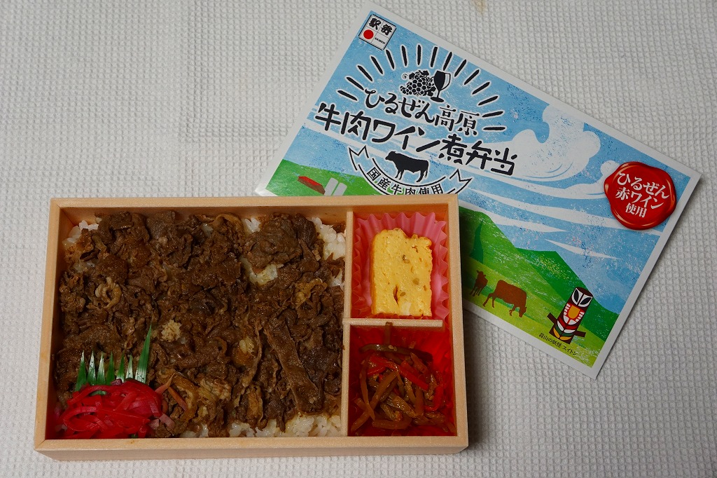 2018(平成30)年9月1日の発売だそうな。白飯をナムルと牛肉煮で覆い、玉子焼と大根桜漬を添える牛肉駅弁。パッケージの既視感と名称の違和感を覚えながら買ってみたら、半年前に同じ売店で買った下の「ひるぜん高原牛肉ワイン煮弁当」とほぼ同じもので、名前を変え、御飯を覆う牛肉を減らしてナムルを加えたものだった。2019年8月限りで終売。