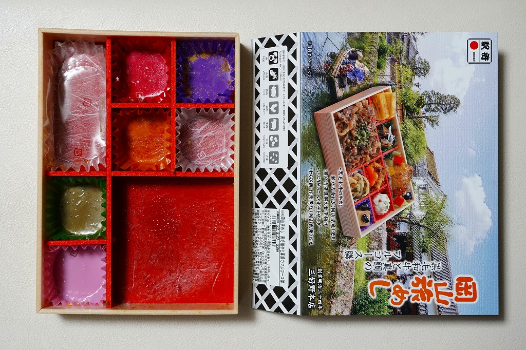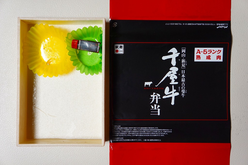 中身はスリーブの写真のとおり、駅弁の名前にあるように、瀬戸内青ねぎを載せた黒毛和牛のぎゅうめし、瀬戸内産真鯛の甘辛揚げ、いぶりがっこ入りポテトサラダ、わらび餅作州黒豆添え、玉子焼、ひじき煮、鶏照焼、野菜コンソメ煮。御飯が牛飯なので、お肉の駅弁のページに入れたが、あるいは幕の内弁当のようなものか。10月以降も販売が継続され、2022年の6月か7月頃まで売られた。