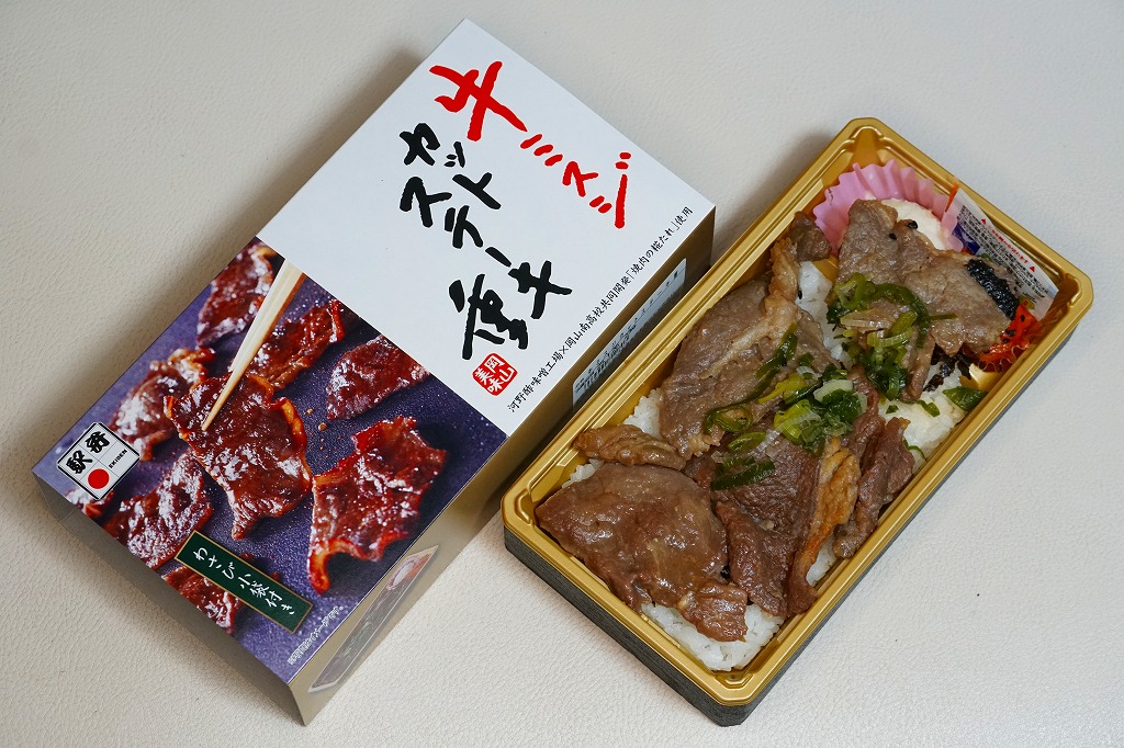 2024(令和6)年7月までに岡山駅などで発売か。白飯を牛焼肉で覆い、ねぎボイルを載せ、ポテトサラダとキャロットラペを添え、わさび小袋を別添。現物でなく公式サイトで「牛ミスジ肉を糀入りのタレに漬込み、香ばしく焼き上げました。」と紹介する牛ミスジカットステーキは、岡山県真庭市の河野酢味噌工場と岡山南高等学校商業学科の生徒が共同開発し2018年4月から市販される「焼肉の糀たれ」をまとい、しかしここでは薄味でホルモンのような硬い肉に難儀した。