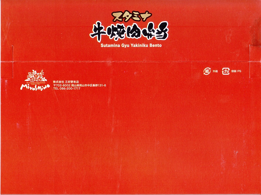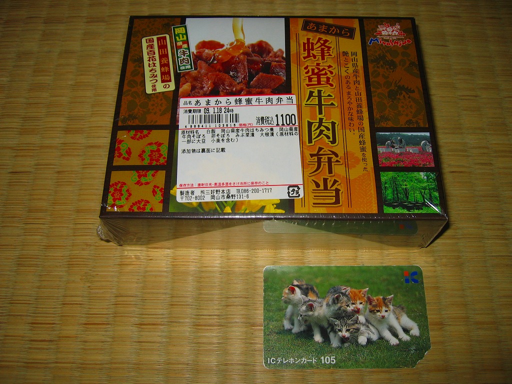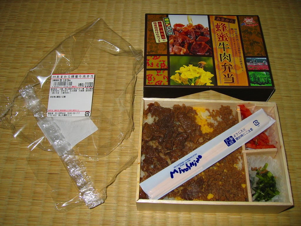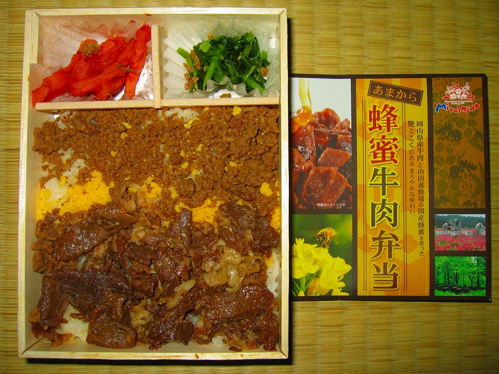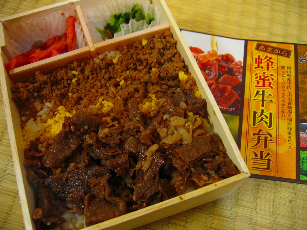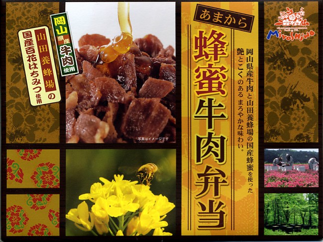 2008(平成20)年7月15日に発売。「おかやま和牛肉弁当」と同じ容器を使用、ボール紙のふたの文字や写真にハチミツがあふれる。中身は岡山県産の白御飯の上に、やはり岡山県産牛の蜂蜜煮とそぼろを敷いて、玉子そぼろも振りかけた牛丼に、みぶ菜漬と大根漬を添えるもの。牛肉はハチミツで甘く、タレで辛く、いやがおうにも食が進むし、少量なのであっと言う間に食べ尽くしてしまう。現存しない模様。