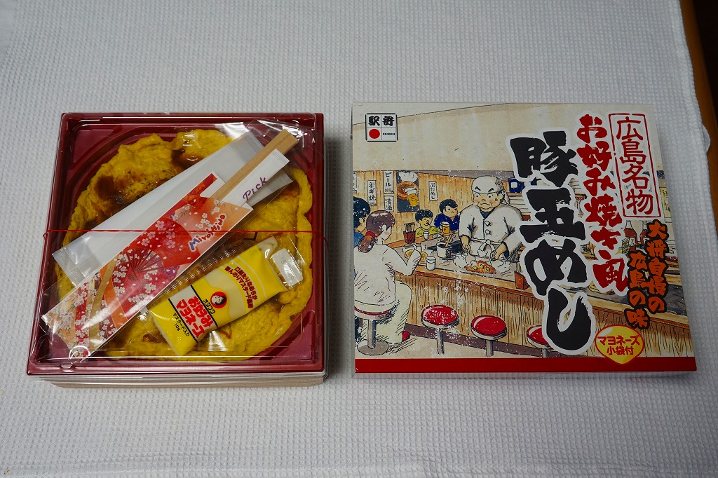 2018(平成30)年秋の新作か。その名のとおり、広島名物お好み焼き風豚玉めし、広島風お好み焼きの中身のうち焼きそばを御飯に置き換えたもの、麺でなく飯にソース味を付け、豚肉と薄焼き卵で覆うものが1枚、正方形の容器にすっぽり収まる。マヨネーズもオタフクのものを添付する、岡山駅弁に見えない広島づくし。2019年までの販売か。