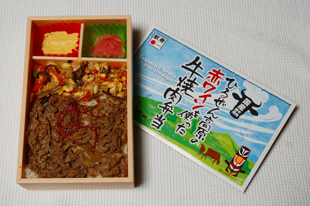 岡山県北部の蒜山(ひるぜん)をテーマにした駅弁として、2017(平成29)年9月1日から30日まで販売。2018(平成30)年4月に再発売。ボール紙のふたの絵柄は、岡山県北部の観光地「蒜山(ひるぜん)高原」の風景や立看板だと思われる。白御飯を牛肉煮で覆い、紅生姜、きんぴらごぼう、玉子焼を添える、 ごく普通の味と内容の牛肉駅弁。再発売も1か月程度か、東京駅限定で実施か。