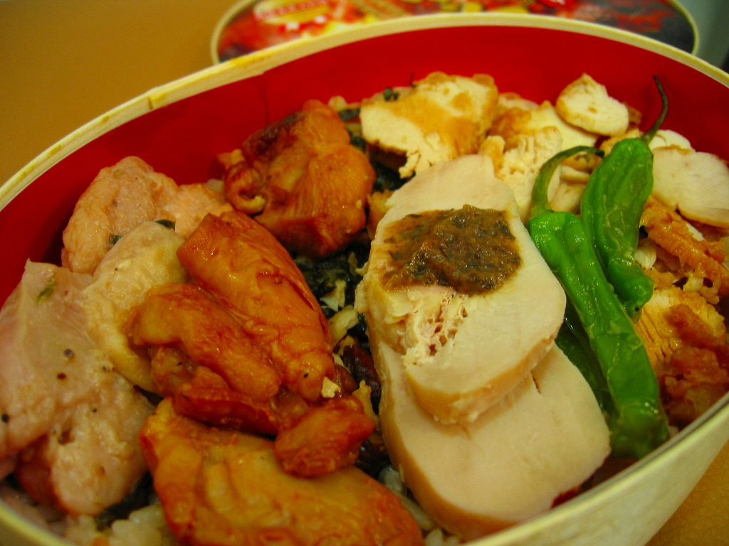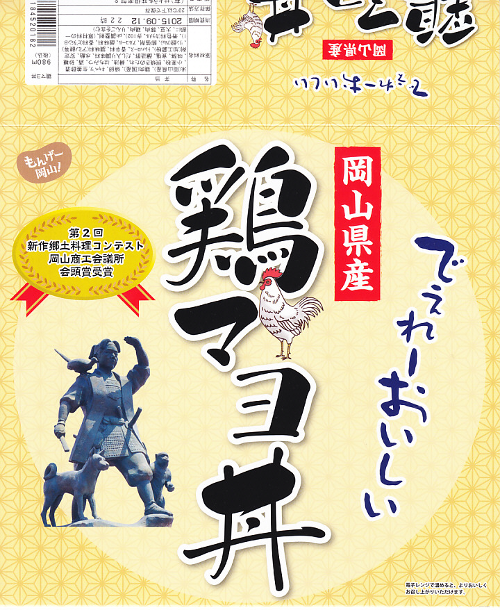 2015(平成27)年春の新作か。詳細は不明だが、岡山商工会議所の「第2回新作郷土料理コンテスト」で会頭賞を受賞したことが、パッケージでうたわれる。岡山駅前の桃太郎像もそこに登場。屋台や惣菜向けな丼に収まる中身は、白御飯にキャベツの千切りを敷いて、鶏照焼をスライスして覆い、玉子焼と紅生姜を添える鶏丼。刻み海苔とマヨネーズを添付し、これをかけて食べる。
