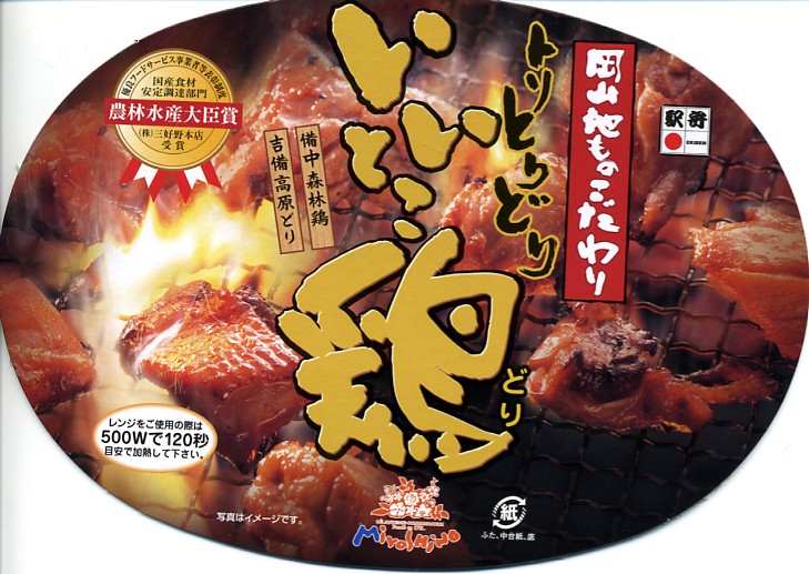 2007(平成19)年9月20日に発売。フタも本体も深さのある経木枠の楕円形の容器を使用、そのフタには食欲をそそる鶏炭火焼の写真を掲載する。中身は餅米入り味付飯の上に鶏肉を載せる鶏丼であるが、鶏肉に岡山県産の備中森林鶏と吉備高原鶏を使用するほか、これを照焼、塩焼、唐揚、蒸しの4種で詰めるため、見た目でも風味でもとても賑やかな内容。飯と鶏の相性も良く、駅弁の名前どおりのいいとこどり。価格は2008年の購入時で900円、2014年時点で980円、2021年時点で900円に戻り、2023年時点で950円、2025年時点で1,100円。
