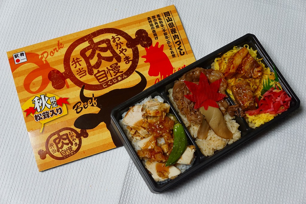 岡山駅の秋の駅弁の新作として、2017(平成29)年9月から12月まで販売。黒いプラ製トレーの3つのくぼみに、白飯を岡山県産の森林鶏の唐揚のスライスで覆う鶏丼、茶飯を黒毛和牛(千屋牛)のしぐれ煮とマツタケで覆う牛丼、茶飯を錦糸卵と岡山県産の豚の角煮と紅生姜で覆う豚丼が、それぞれ収まる。本来の販売期間が過ぎた真冬の東京への輸送の影響か、牛の脂と豚の赤身はカチカチで、鶏照焼の乱切りの、ササミ風のあっさり感と衣のクリスピーが美味だった。