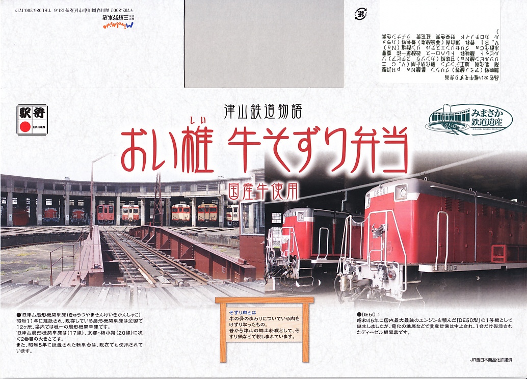 スリーブの写真から分かるとおり、テーマは津山扇形機関車庫。JR津山駅構内に残る、建屋が扇形をした機関車の車庫にちなみ、容器は扇形、バランは汽車、肉は津山の味、番茶は美作(みまさか)。その他スリーブの上面や底面に、小さい文字で様々な情報が記される。半年間ほどの販売か。