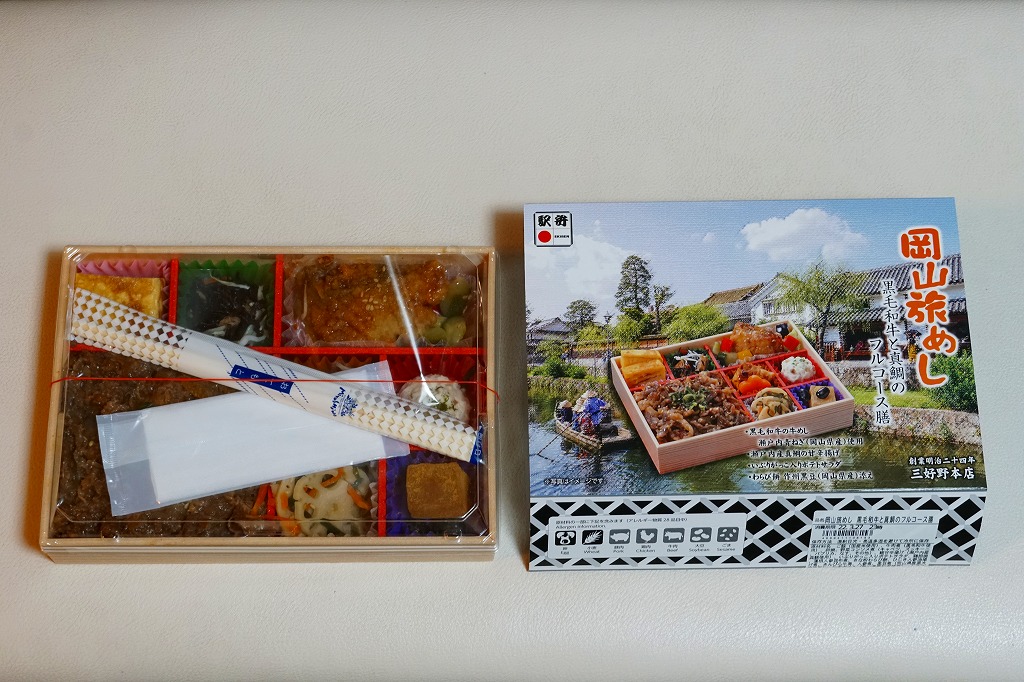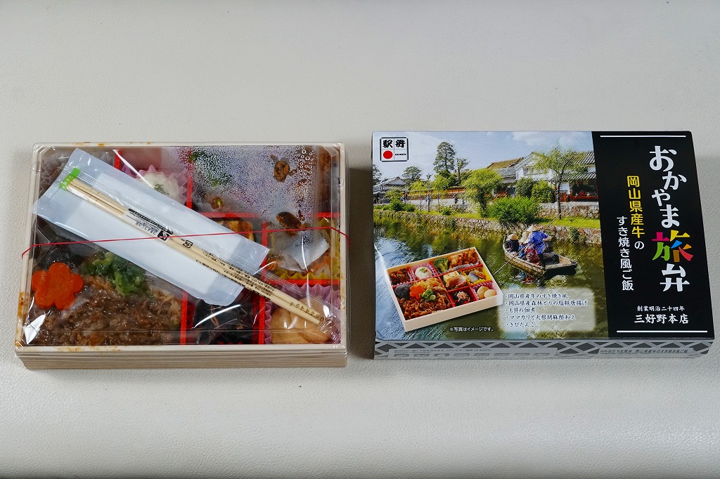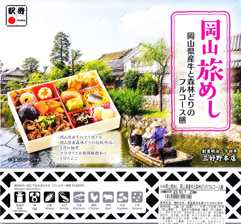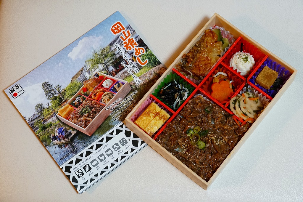 2025(令和7)年7月に岡山駅などで発売か。あるいは「岡山旅めし岡山県産牛と森林どりのフルコース膳」の改称なのだろうか。新作の駅弁として、10月からのJR東日本の駅弁キャンペーン「駅弁味の陣2025」にエントリー。スリーブの絵柄は以前の「岡山旅めし」と同じ絵柄の、倉敷美観地区の風景と蔵でできている。中身は地産食材から郷土料理まで味わえるお弁当といい、白飯を牛肉や煮物で覆う「岡山県産牛のすき焼き風」に、岡山県産森林どりの塩糀唐揚げ、も貝の佃煮、ママカリと大根胡麻酢和え、ポテトサラダ、玉子焼、柿入り大根なます、合鴨スモーク、人参油揚げ入りひじき煮、ブロッコリー煮、きびだんご。名前から牛肉弁当に思えて、中身は「倉敷小町」や「後楽園のお弁当」のような季節物の岡山駅弁に感じた。あるいはそれらの生まれ変わりか。
