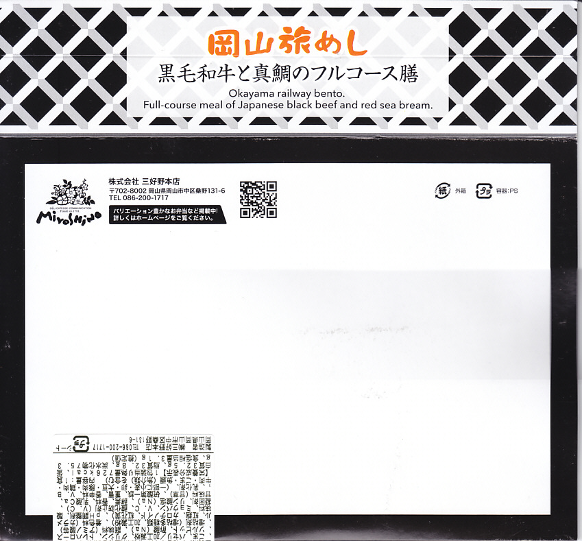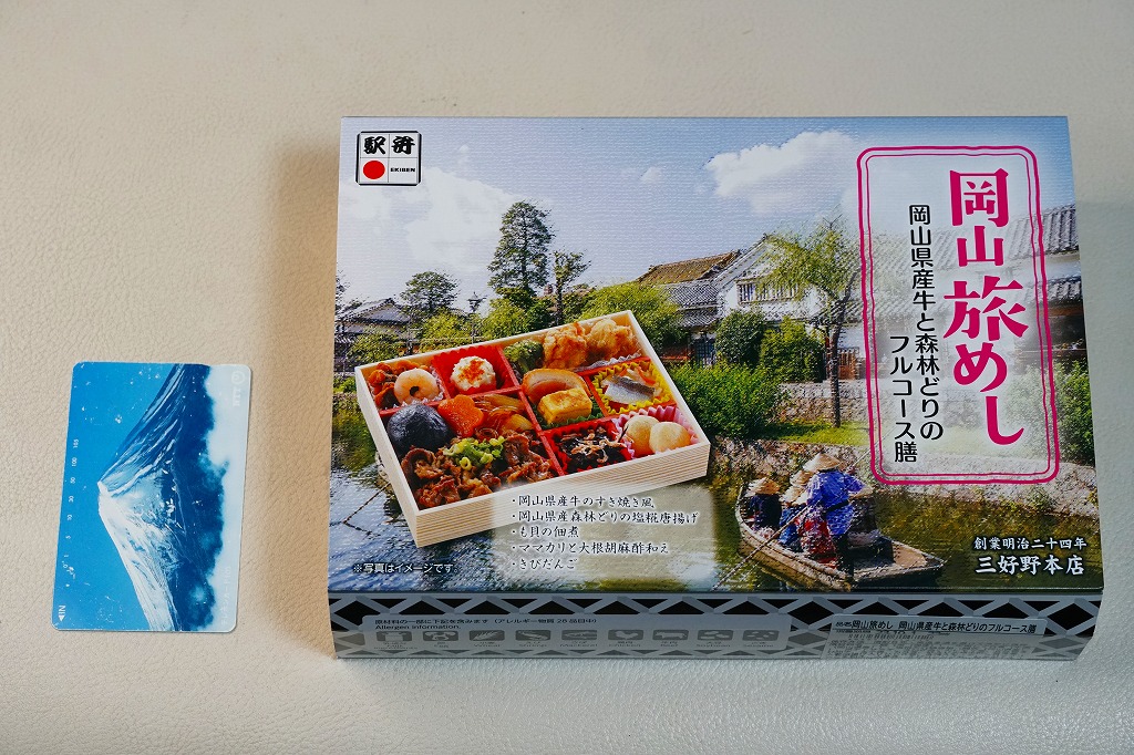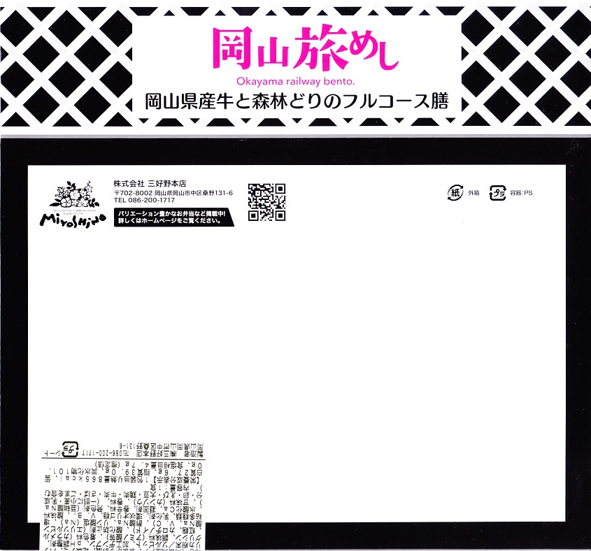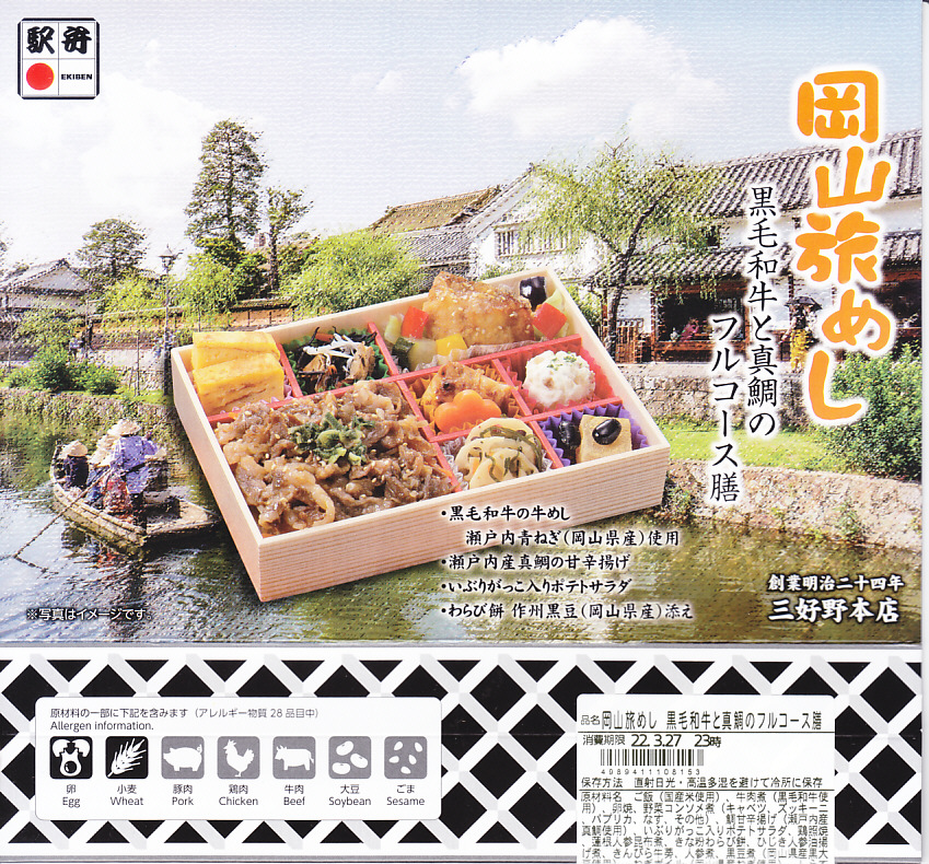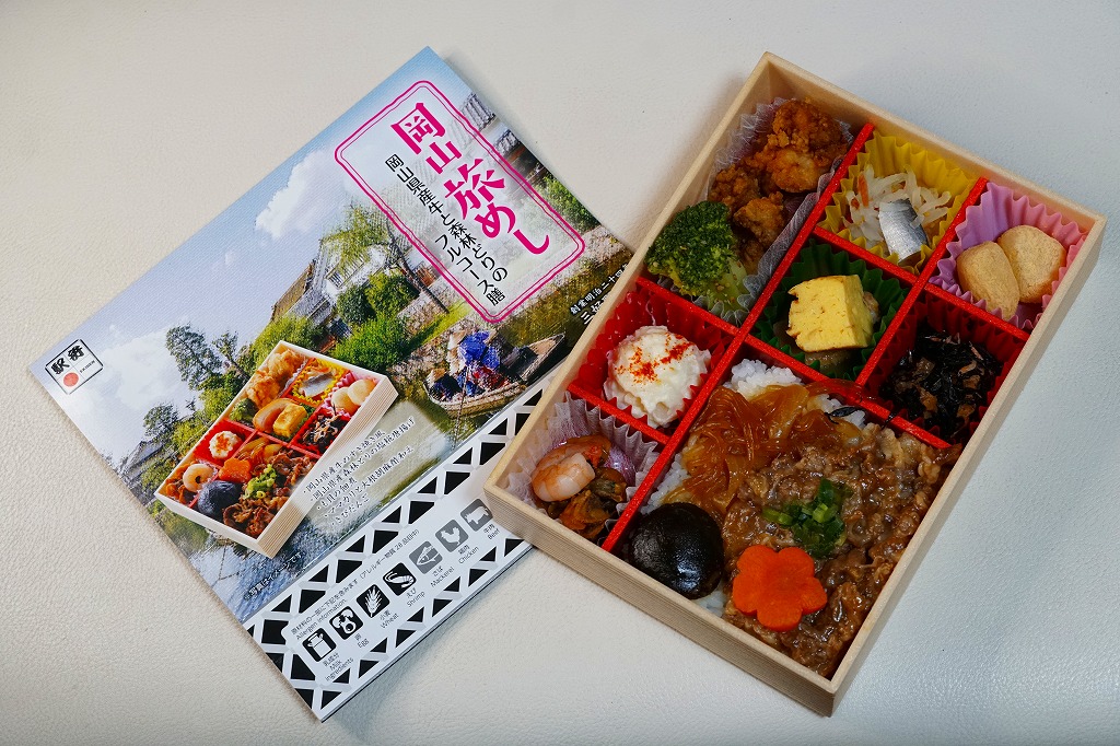 2025(令和7)年7月に岡山駅などで発売か。あるいは「岡山旅めし岡山県産牛と森林どりのフルコース膳」の改称なのだろうか。新作の駅弁として、10月からのJR東日本の駅弁キャンペーン「駅弁味の陣2025」にエントリー。スリーブの絵柄は以前の「岡山旅めし」と同じ絵柄の、倉敷美観地区の風景と蔵でできている。中身は地産食材から郷土料理まで味わえるお弁当といい、白飯を牛肉や煮物で覆う「岡山県産牛のすき焼き風」に、岡山県産森林どりの塩糀唐揚げ、も貝の佃煮、ママカリと大根胡麻酢和え、ポテトサラダ、玉子焼、柿入り大根なます、合鴨スモーク、人参油揚げ入りひじき煮、ブロッコリー煮、きびだんご。名前から牛肉弁当に思えて、中身は「倉敷小町」や「後楽園のお弁当」のような季節物の岡山駅弁に感じた。あるいはそれらの生まれ変わりか。