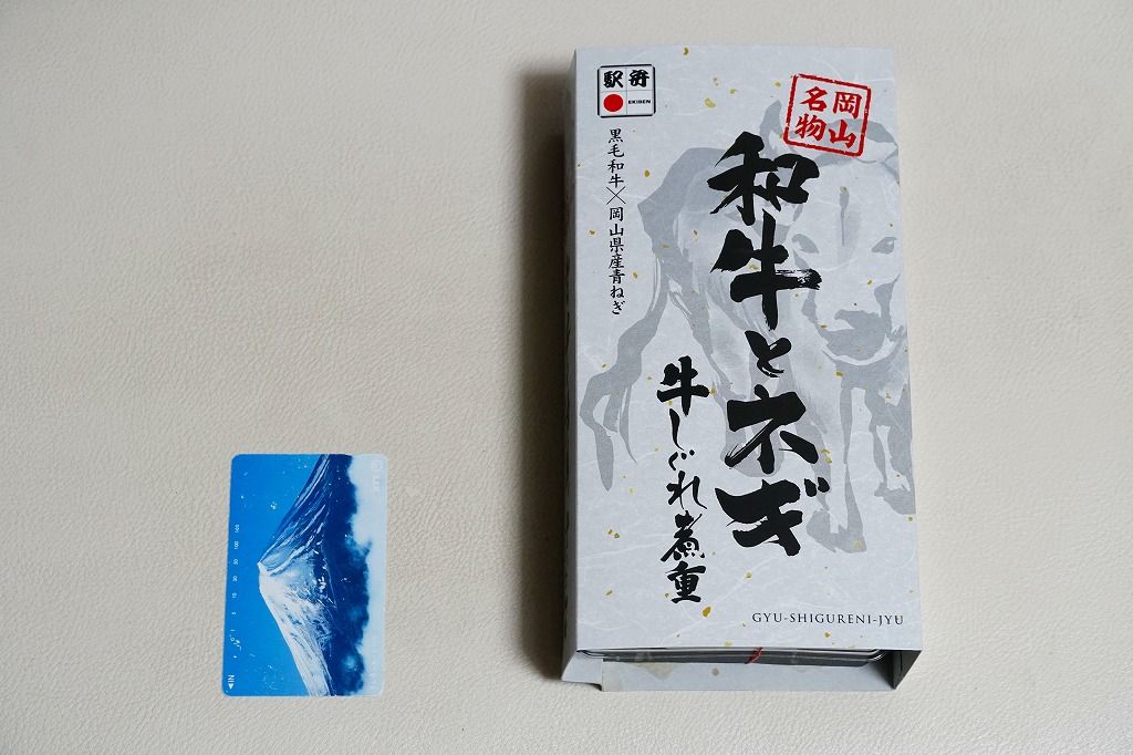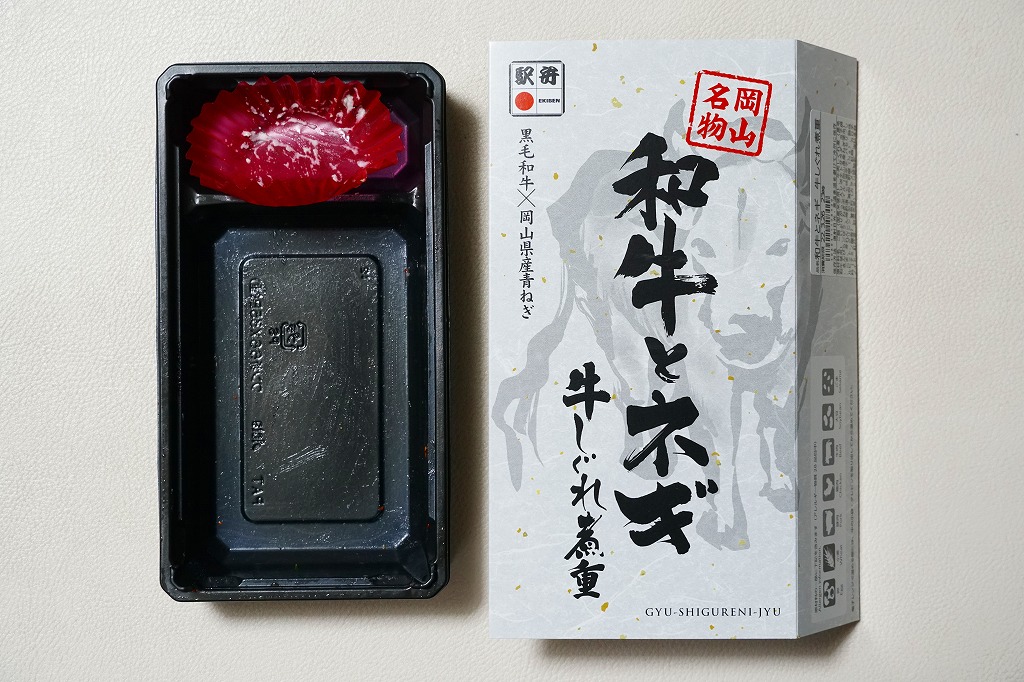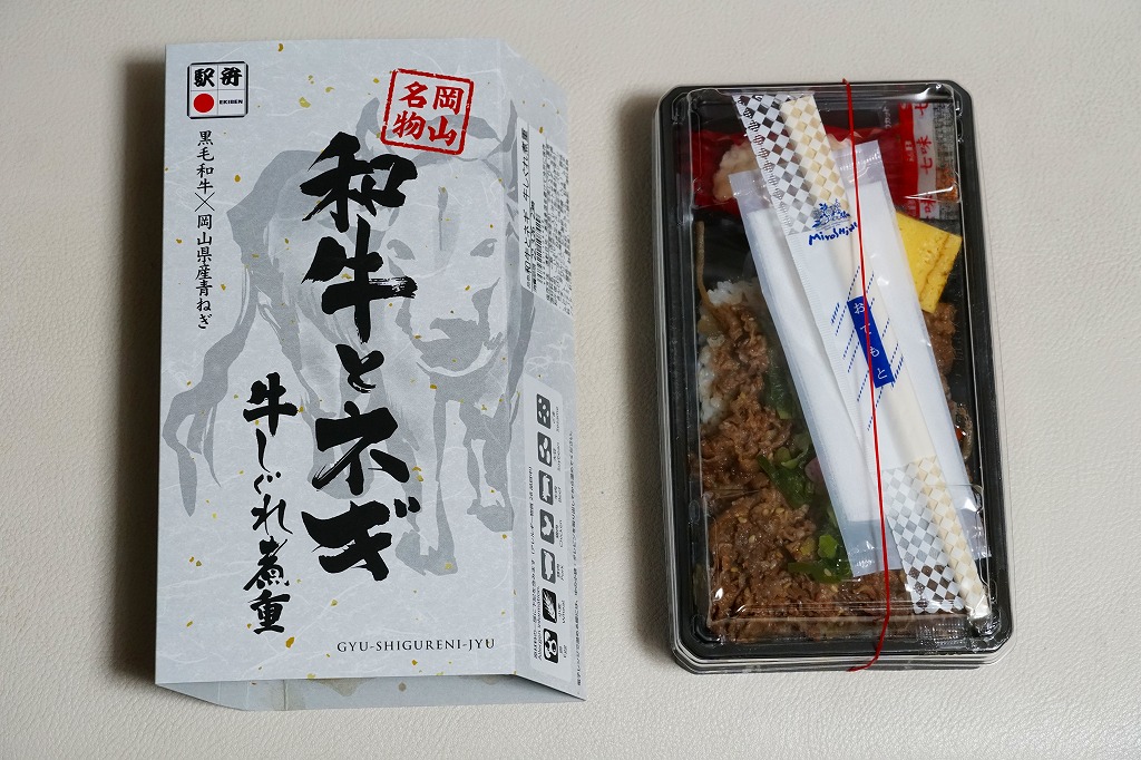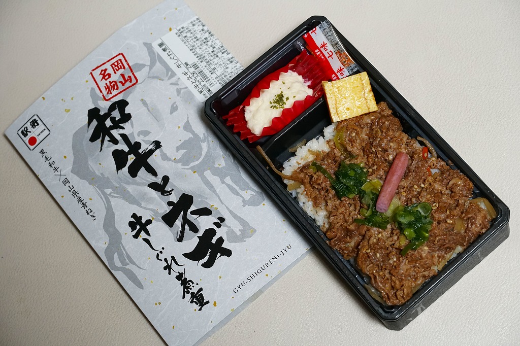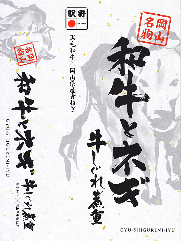 2021(令和3)年7月に「和牛とネギ牛カルビ重」「黒毛和牛の四種盛り弁当」とともに発売。駅弁ではあまり見られないと思う、白いスリーブに収めた長方形の容器に、白飯を詰め、きんぴらごぼうと黒毛和牛の牛肉煮で覆い、瀬戸内青葱出荷組合の「ぐんぐんの青ねぎ」と芽れんこんで彩り、ポテトサラダと玉子焼と七味唐辛子を添える。白飯を牛肉煮で覆う普通の牛丼駅弁に見えて、ネギなどの添え物での味を盛り立て、強い味付けで飯が進む。「岡山名物」にならなくても、元気が出る駅弁。2022年で終売か。