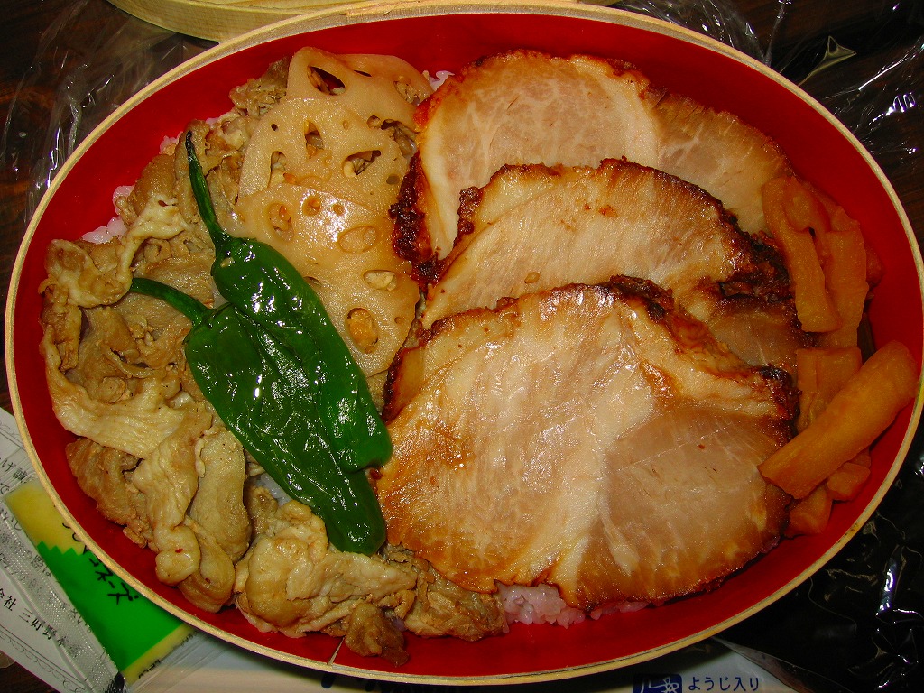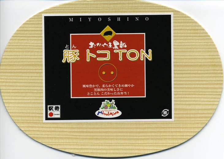 2004(平成16)年の夏頃に発売。楕円形の経木枠の容器に縁が付いたふたをして、掛紙代わりの商品名シールを貼って、ラップで包み食品表示ラベルを貼る。中身は白御飯の上に岡山県産黒豚の焼豚が数切れと塩胡椒炒めがたっぷり入り、レンコンや青唐などが入り。タレと辛子マヨネーズの袋を添付する。味はあっさりした豚肉の脂味豊かな豚丼で、マヨネーズとの相性が良く分量もそこそこあり、軽い名前に違い重量感のある感じ。商品名を単に「豚丼」などとしなかったことは、吉と出るか凶と出るか。価格は2005年の購入時で900円、2014年時点で1,080円。2014年までの販売か。
