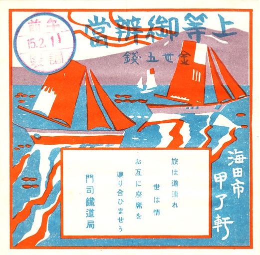 1926(大正15)年2月11日の調製と思われる、昔の海田市駅弁の掛紙。瀬戸内海とヨットと、中国山地の山並みを描いたものか。甲了軒は1900(明治33)年に創業し山岡保太郎が営業した海田市駅の駅弁屋。1943年に広島駅の3者と海田市駅の2者が合併し、現在の広島駅弁当となった。