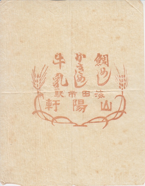 1930年代のものと推定する、昔の海田市駅弁の掛紙。その絵柄や紙質から、駅弁の掛紙でなく食堂か弁当のナプキンではないかと思う。当時に駅売りされたであろう商品名が列記された。調製元の山陽軒は、1943年に5社が合併してできた、現在の広島駅弁の広島駅弁当の前身のひとつ。