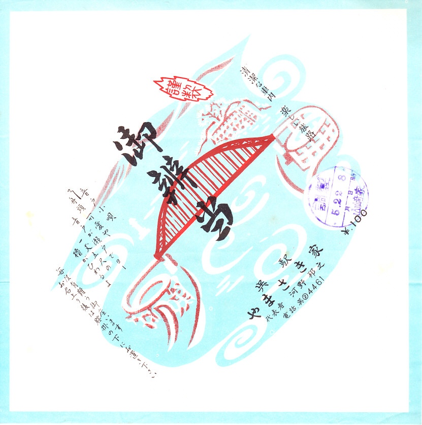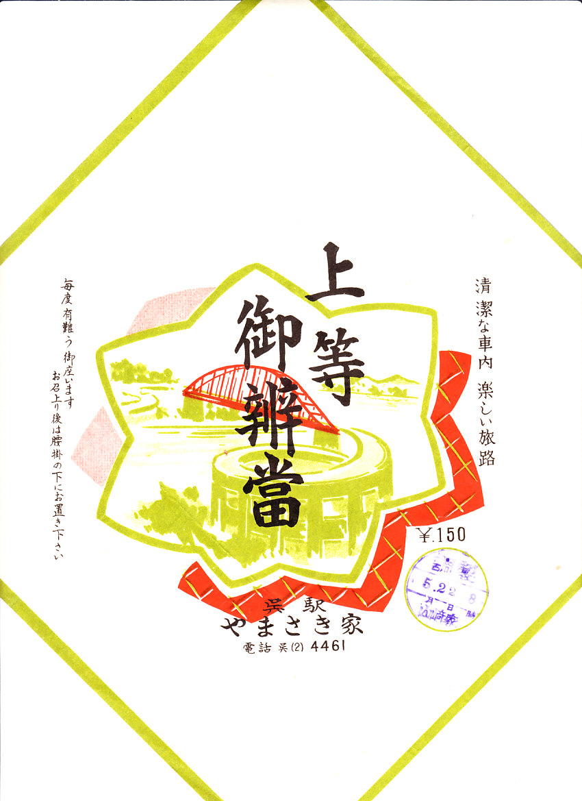 1965年頃の、5月22日8時の調製と思われる、昔の呉駅弁の掛紙。こちらでは音戸大橋を、1961年の開通当時に世界でも珍しい取付道路と紹介された、半径24メートルの螺旋型高架橋を中心に描いた。