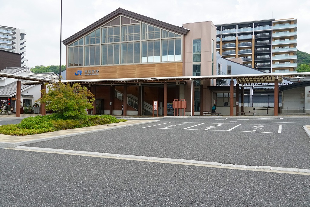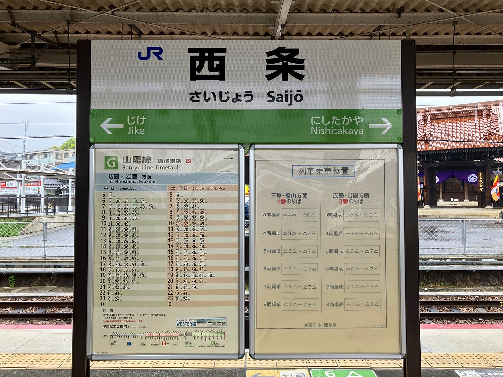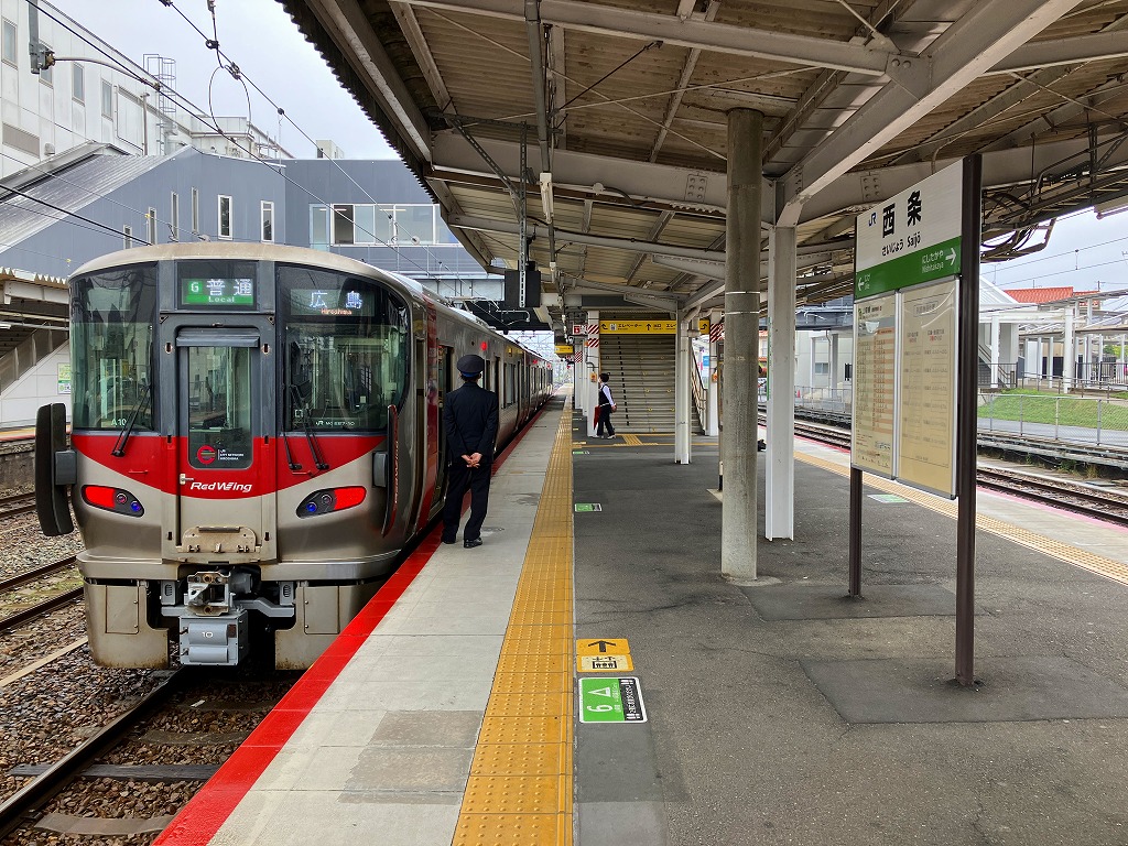 広島駅から山陽本線の電車で約40分。東広島市は広島県の中央に位置する、人口約20万人の市。盆地の西条や瀬戸内海の安芸津が酒造で知られるほか、広島市郊外の丘陵地に大学や空港に商工業や住宅が進出して発展した。駅弁はないが、当時市販の鉄道時刻表や興信録によると、明治時代あるいは第二次大戦前に駅弁があったらしい。1894(明治27)年6月10日開業、広島県東広島市西条本町。