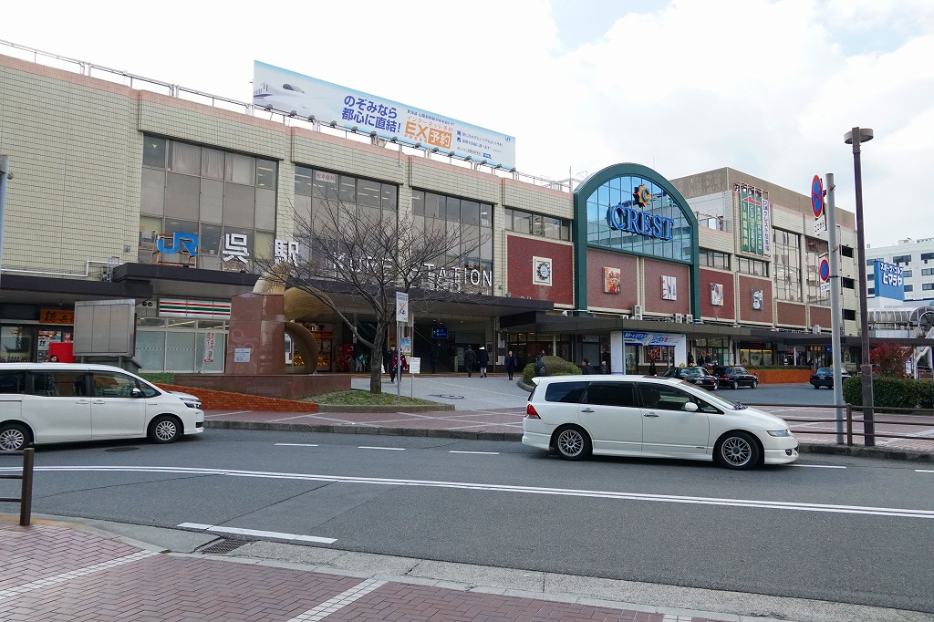 広島駅から電車で約40分。呉市は広島県の南西部で瀬戸内海に面した、人口約21万人の港町。第二次大戦までは海軍が、戦後は海上自衛隊が拠点を構える軍港であり、造船や鉄鋼など軍需産業で発展した臨海工業都市である。駅弁は国鉄時代から21世紀まで存在したが自然消滅。1903(明治36)年12月27日開業、広島県呉市宝町。