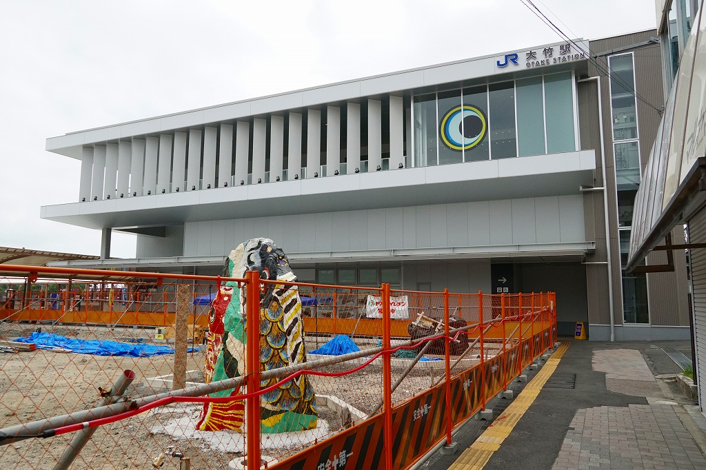 広島駅から山陽本線の電車で約45分。大竹市は広島県の南西端で瀬戸内海に面する、人口約2万人の工業都市。古くは山陽道と瀬戸内海を結ぶ港町であり、昭和時代に繊維、海軍、製紙、石油化学といった産業の進出で市制を敷く都市となった。大竹駅に駅弁はないが、貨物列車が発着したり山陽新幹線の開通前は特急列車が停車した主要駅であり、当時市販の鉄道時刻表によると1904年に駅弁販売駅だったという。1897(明治30)年9月25日開業、広島県大竹市新町一丁目。