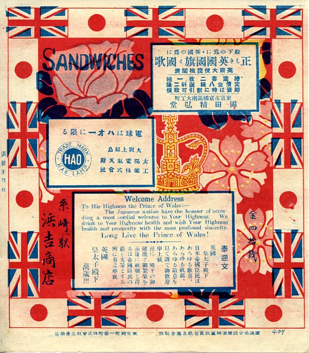 1922(大正11)年の調製と思われる、昔の糸崎駅弁の掛紙。同年に上野公園で開催された平和記念東京博覧会で英国の皇太子殿下が来日されたことを記念して、全国各地の駅弁屋が同じデザインの記念掛紙を使用したもの。周囲に日本と英国の国旗を配し、右に駅弁の名前、左下に調製元、下部に日英の歓迎文、上部の2枠は広告枠。