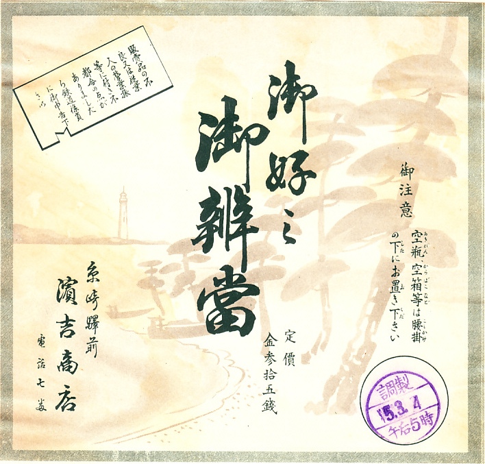 1926(大正15)年3月4日の調製と思われる、昔の糸崎駅弁の掛紙。この白砂青松の背景は、糸崎や瀬戸内海の風景か、あるいはイメージイラストか。左上の注意書きが切符型であることは、磁気券やICカードに自動改札の時代なると、解説が必要になってきたか。