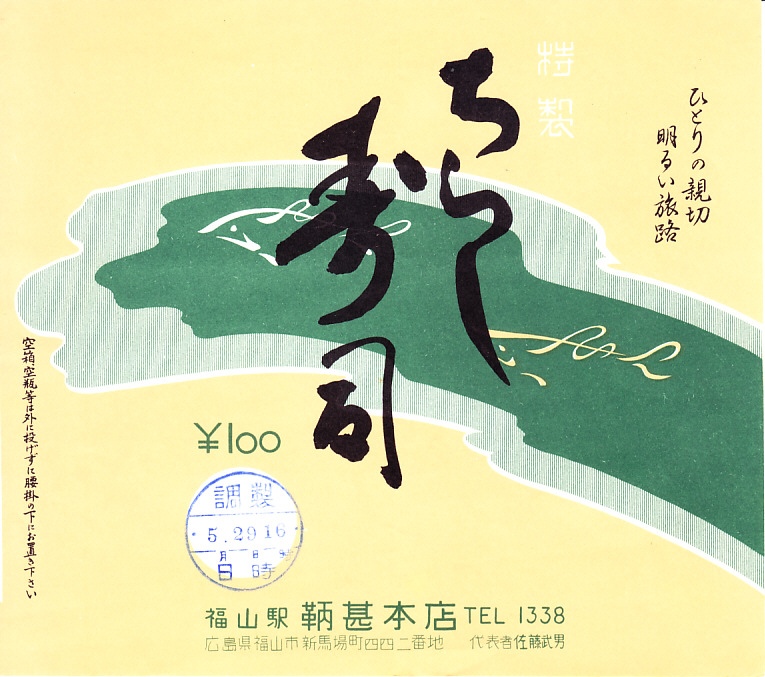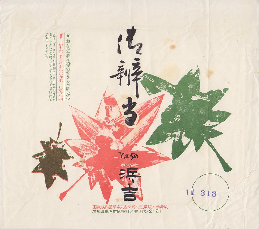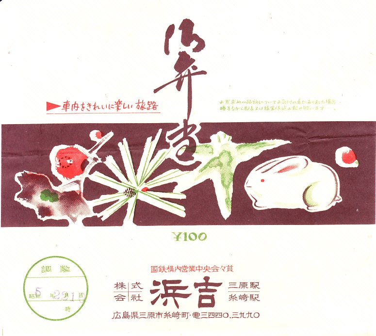 1960年代の、5月22日10時の調製と思われる、昔の三原駅弁の掛紙。記載内容からして駅弁の掛紙に違いないが、絵柄は市中あるいは市販の弁当のもののようにみえる。駅名の列記で糸崎駅より三原駅が上になっており、糸崎の機関区が鉄道の要衝だった汽車の時代が終わったことがうかがえる。