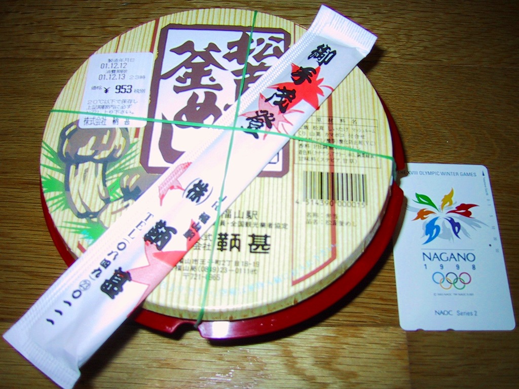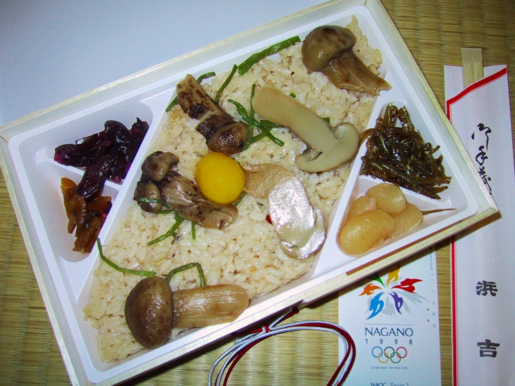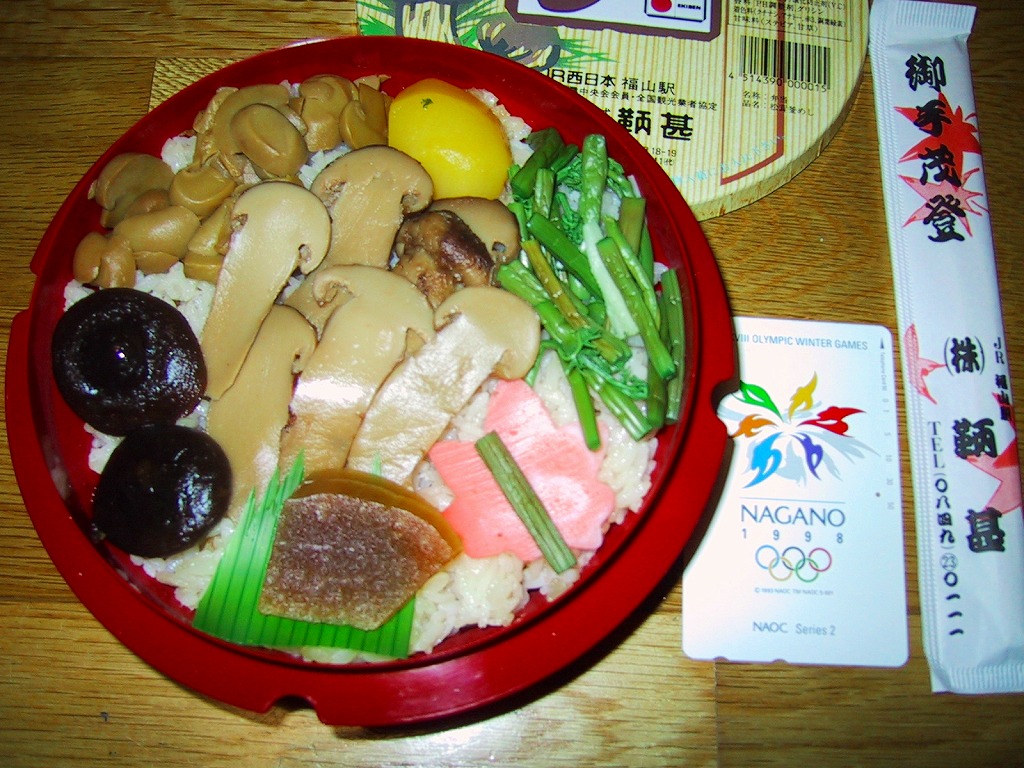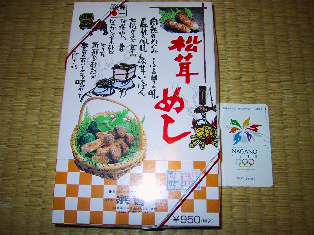釜を模したプラ容器の中身は、醤油御飯の上に駅弁の名前にもある松茸はもちろん、栗に山菜に紅葉型蒲鉾に付け合わせ、そして椎茸になんとマッシュルームが載る、釜飯風駅弁。薄い釜にボール紙を立体にし強度を付けたふたという具合の、廃棄物減量型容器。駅弁業者の倒産により2003年1月14日限りで失われた。