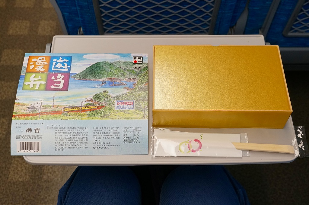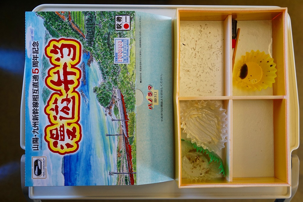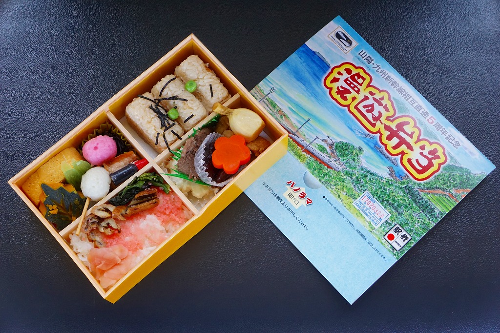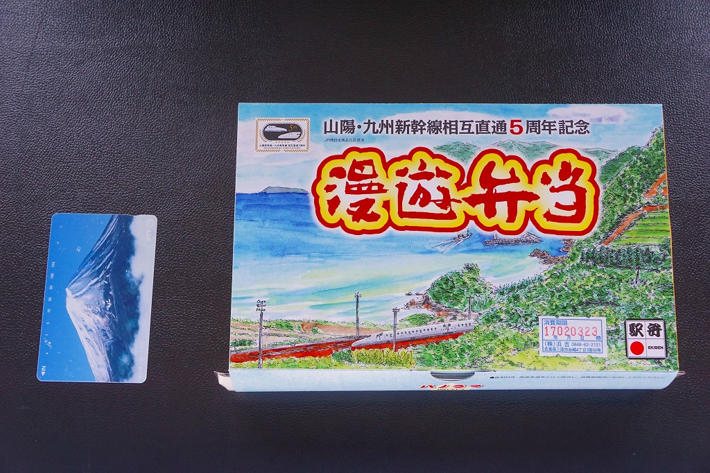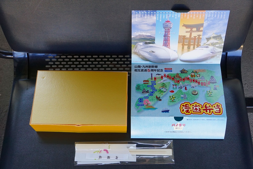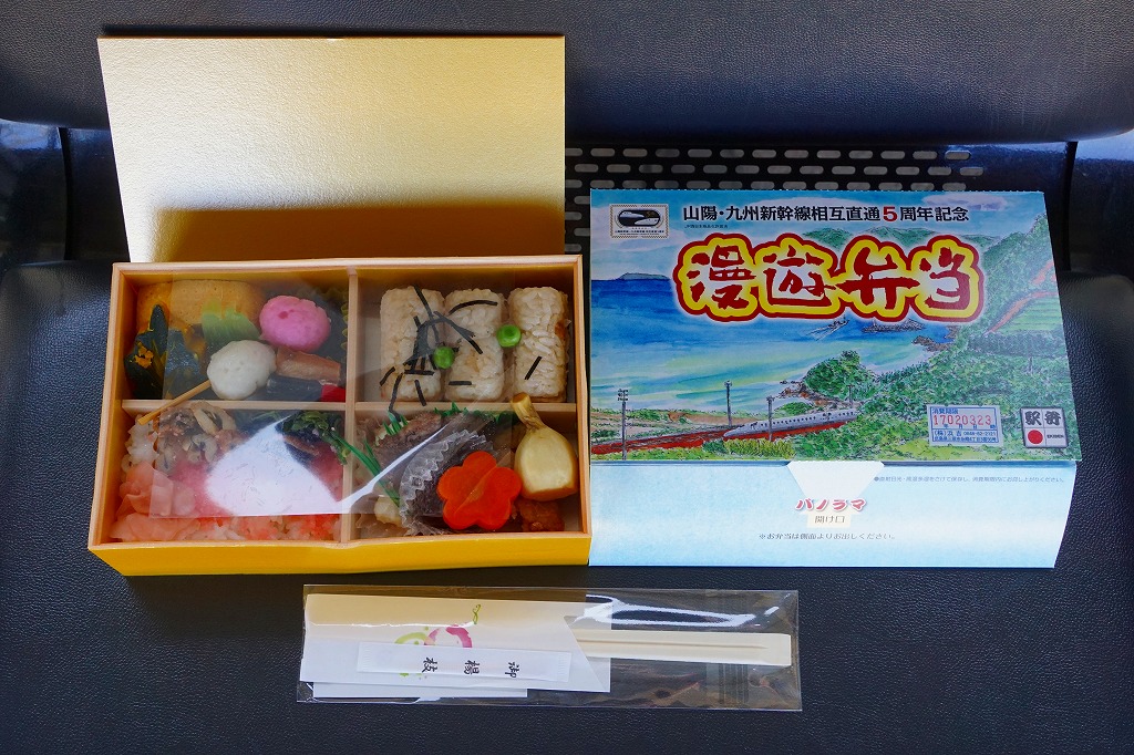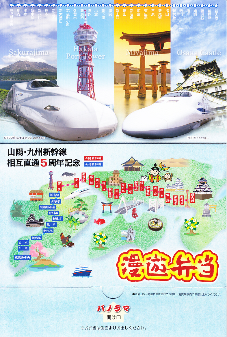 この名前では2016(平成28)年3月に発売。発売時点で日本一よみがなの長い駅弁。福山駅の駅弁「漫遊弁当」について、山陽・九州新幹線の相互直通5周年を記念して、駅弁の名前とパッケージの絵柄をこれにちなんだ。ふたを開くと両新幹線や沿線の写真と路線図が現れるが、「パノラマ 開け口」の表記で期待したような、飛び出す絵本のようにはなっていない。