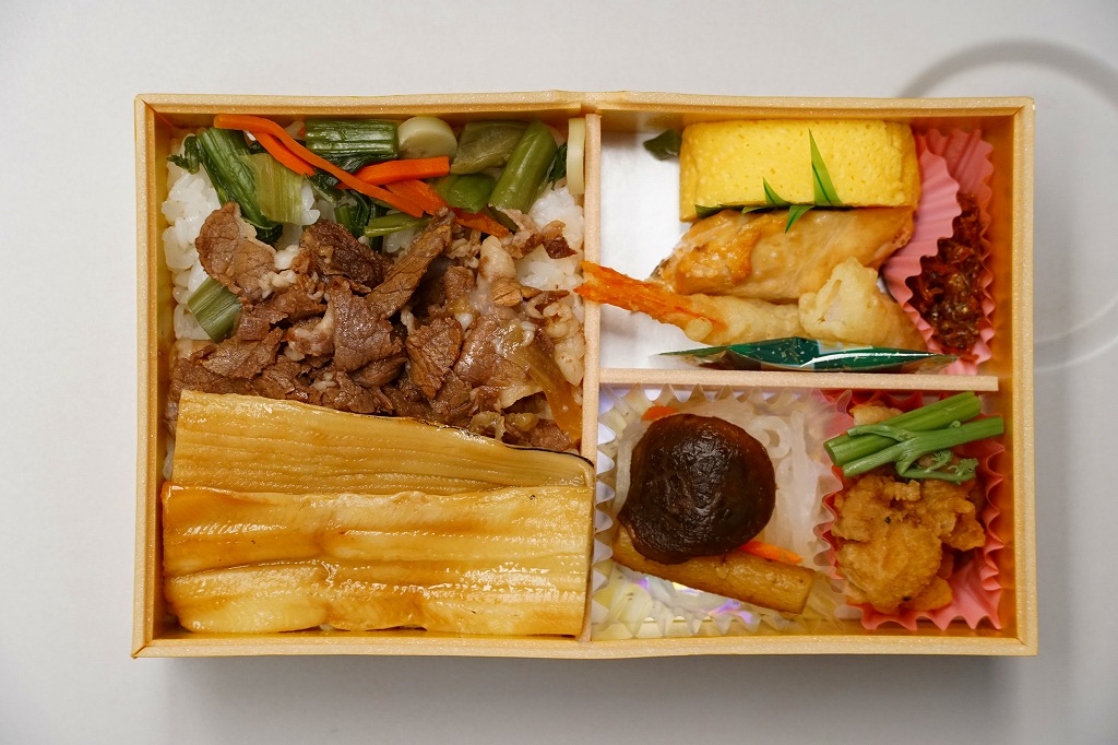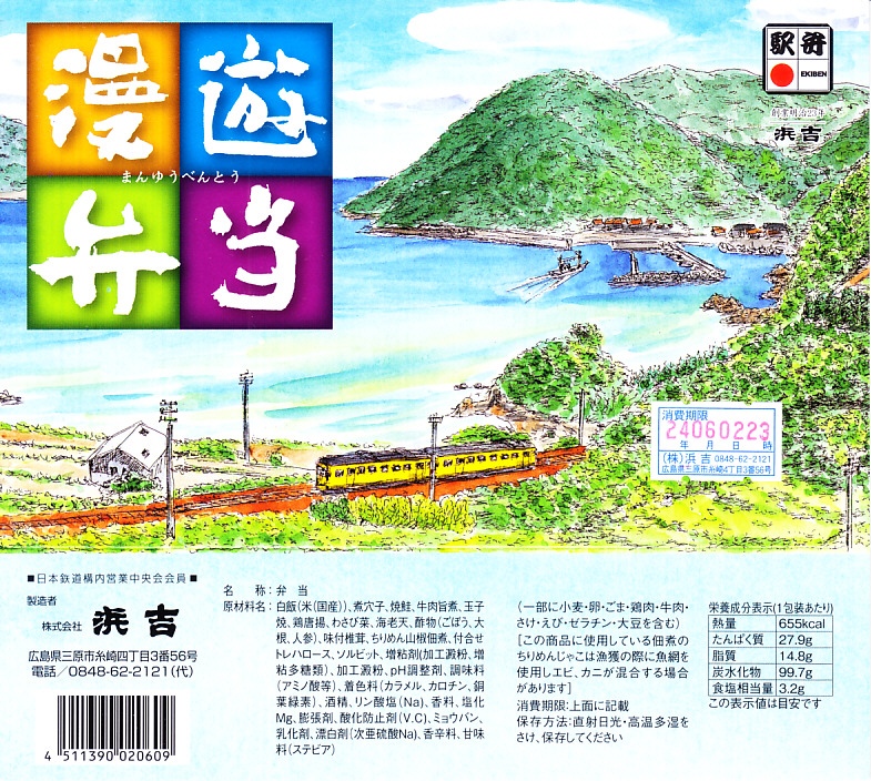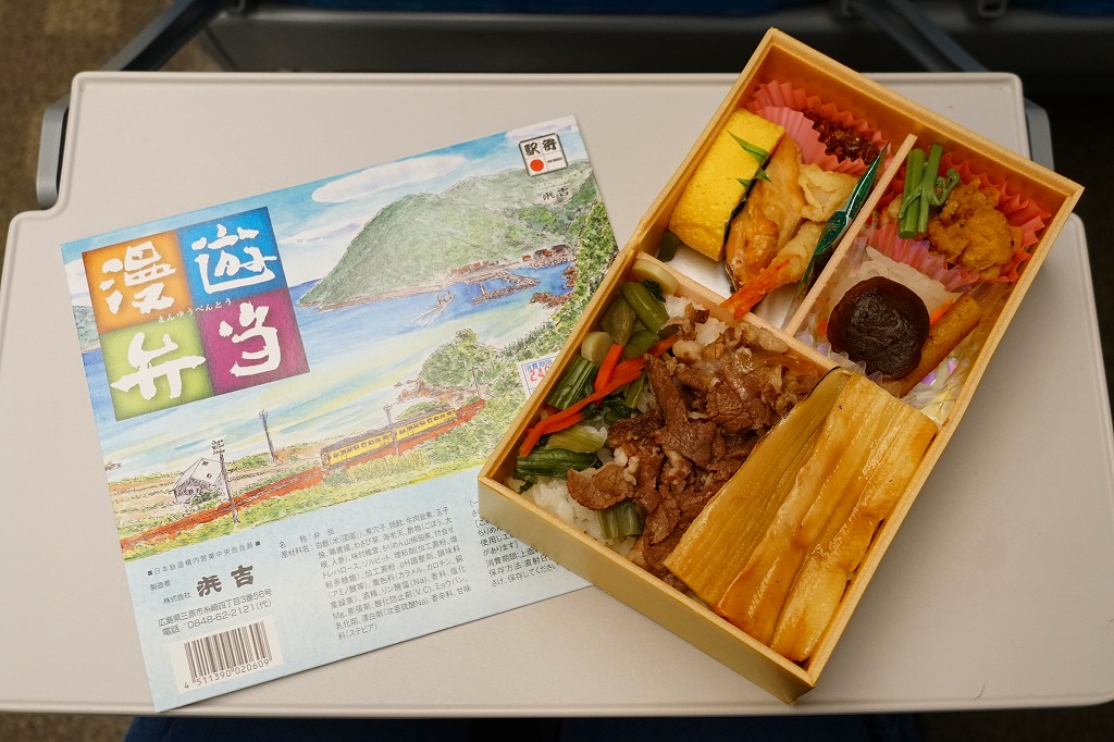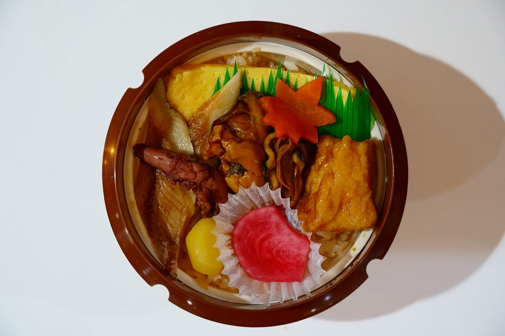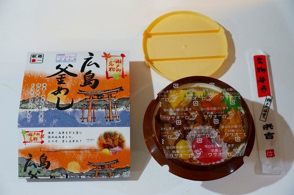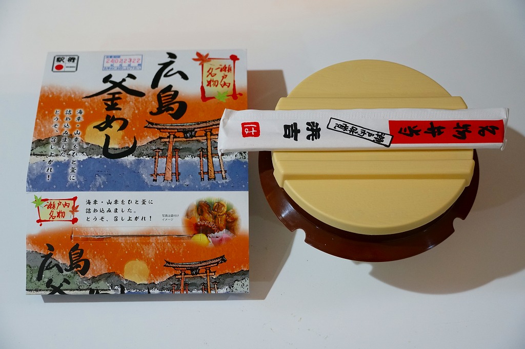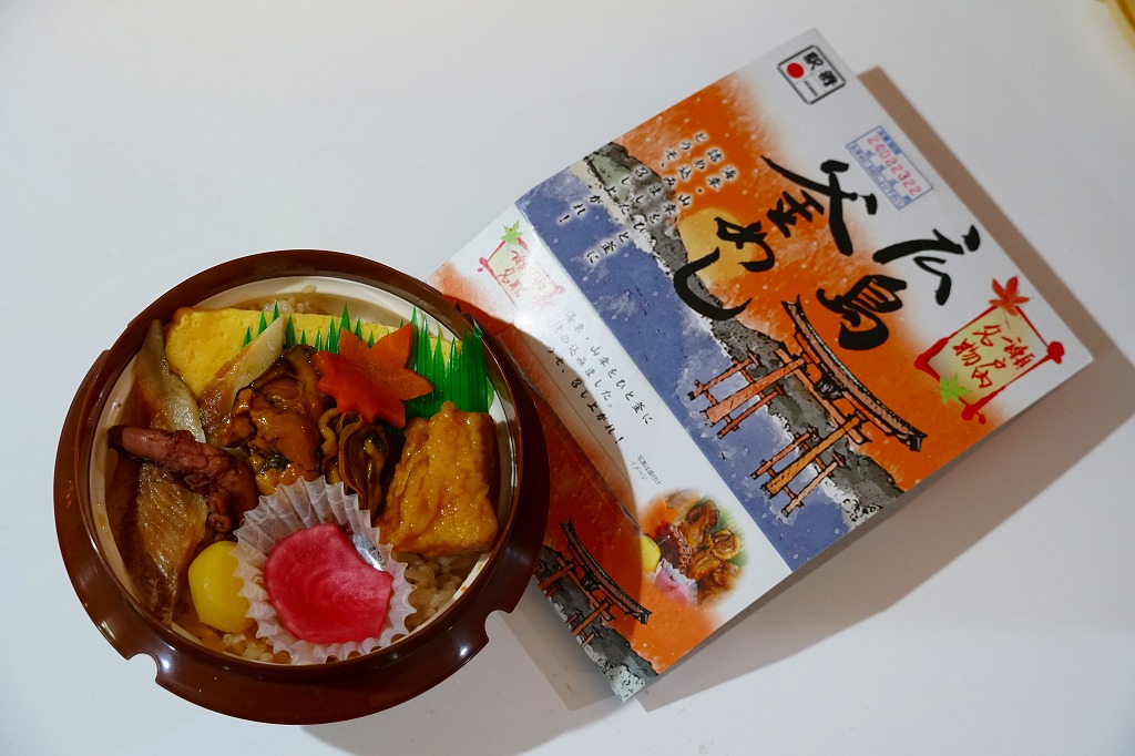 秋冬の駅弁大会シーズンに向けた、2020(令和2)年秋の新商品か。宮島を描いたスリーブに収めたプラ製の釜型容器に、茶飯を詰め、鶏肉の甘酢漬、かきの甘辛煮、煮あなご、たこの旨煮、玉子焼、くり、もみじ型にんじん、赤大根で覆う。現地でなく催事で売られる商品だろうが、具を眺めると広島や瀬戸内を感じられるし、それらの具は福山駅の駅弁にも入っているため、現地へ行かずとも旅気分を味わえる駅弁として優れるのかも。価格は2020年の発売時で1,080円、2022年時点で1,130円、2023年時点で1,150円、2024年時点で1,250円。2024年までの販売か。