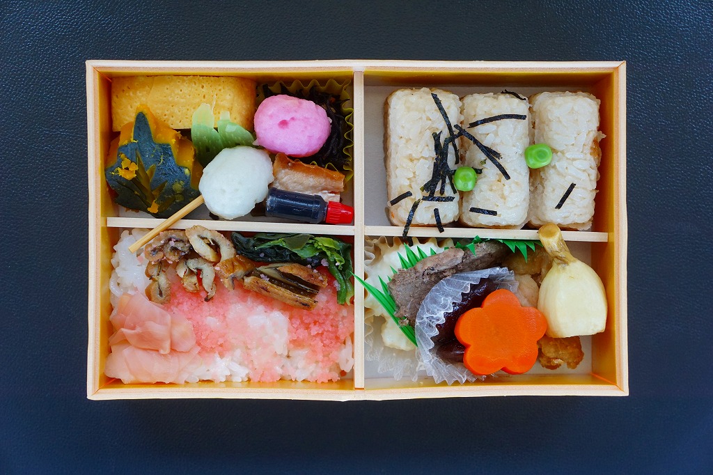 中身はアナゴとタイそぼろのちらし寿司、茶飯の俵飯3個、練り物やカボチャなどの煮物、牛肉や鮭などの焼き物などで、沿線の名物にちなんでいるようには見えない。一年間販売し、2017(平成29)年に元の漫遊弁当へ戻った。
