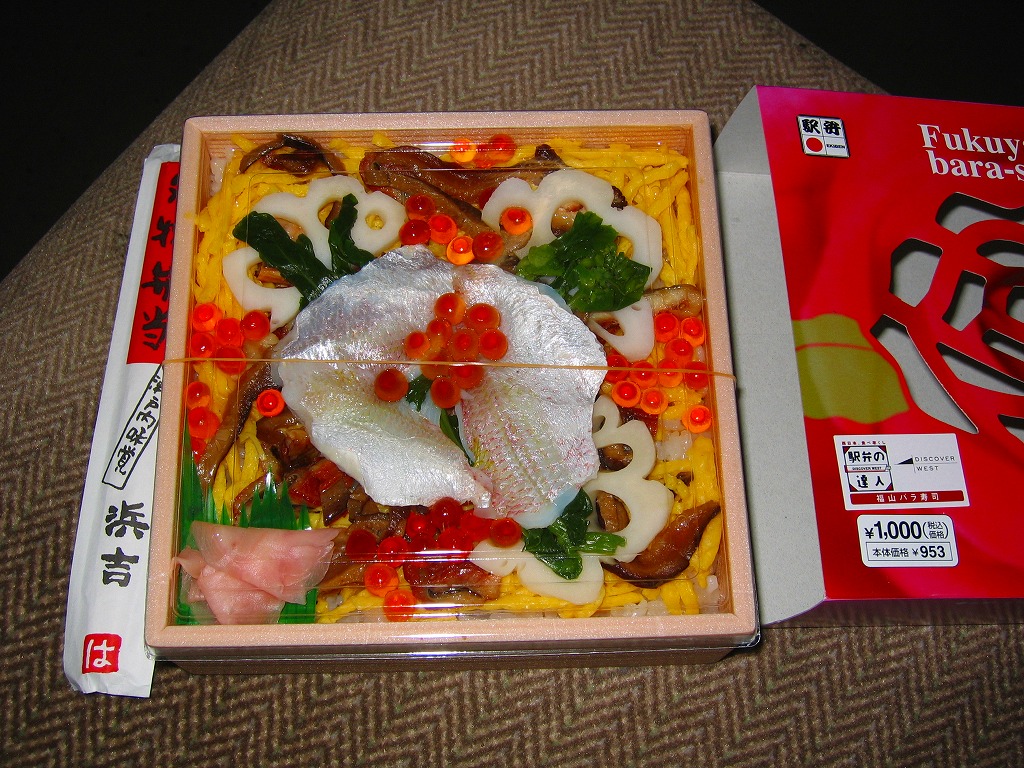 上記の駅弁「福山ばら寿司」の、2004(平成16)年時点での姿。売り場での見た目は、上記の2025年のものと変わらないようにみえる。当時のスリーブは中身が少し見えるよう、バラの花びらの部分がくり抜かれていたほか、中身でバラを象った魚の身がサーモンでなく小鯛の酢漬けだった。