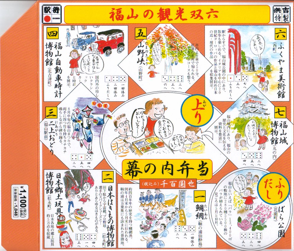JRダイヤ改正による福山駅の新幹線「のぞみ」停車を記念して、2003(平成15)年10月1日に発売。正方形のボール紙容器のふたに福山の観光名所を巡る双六を印刷、その裏には組立式のサイコロとコマが挟み込まれている。