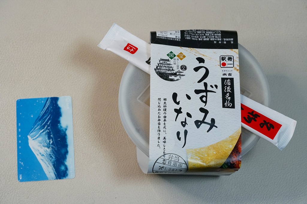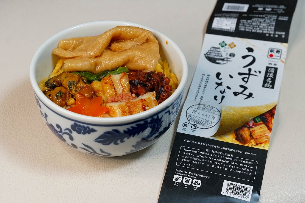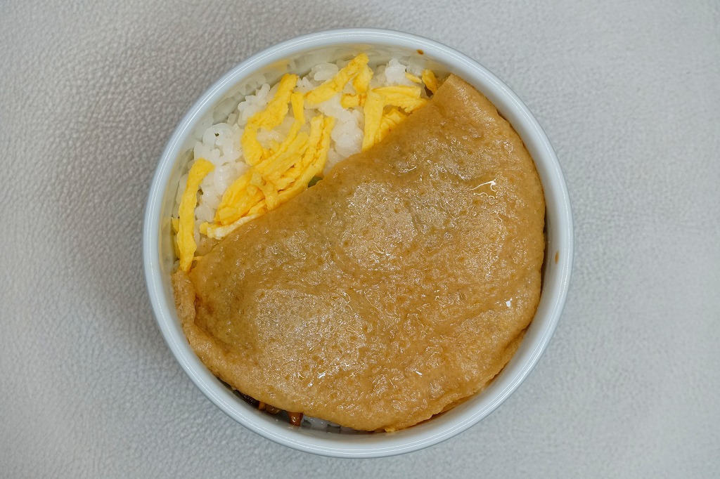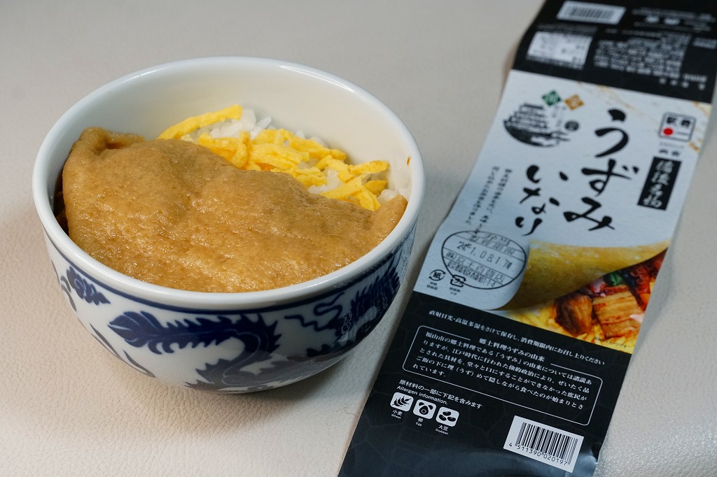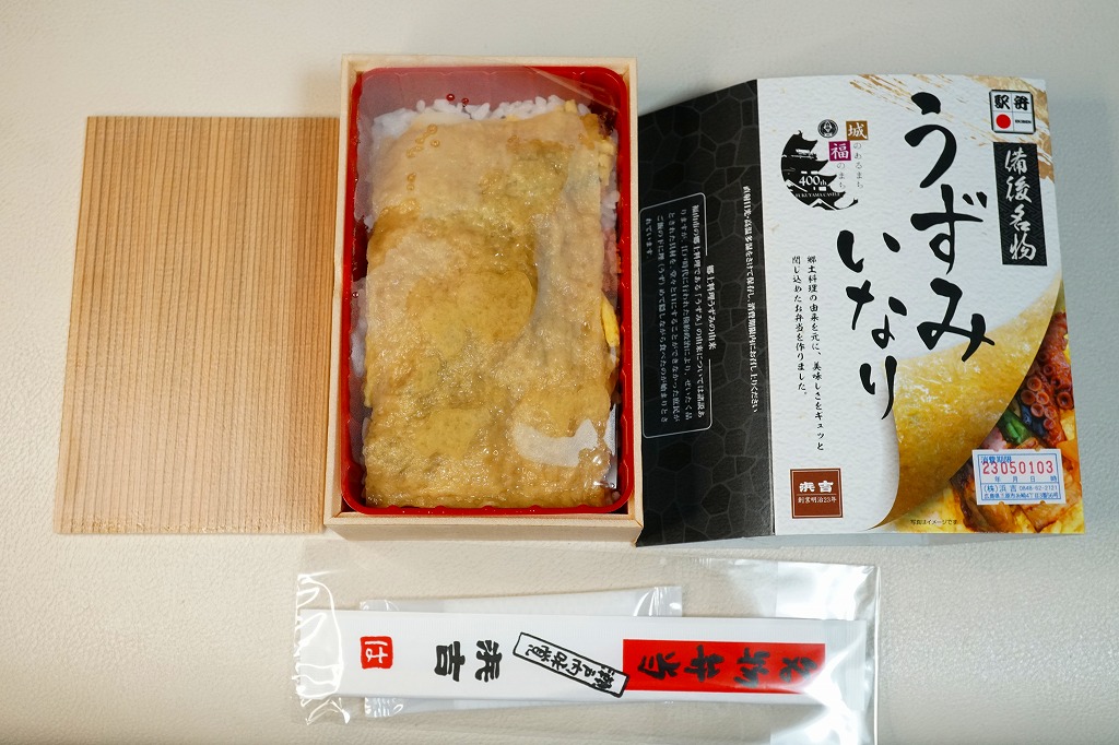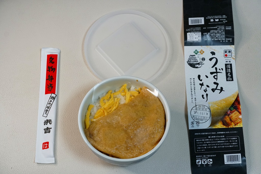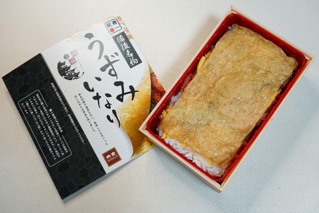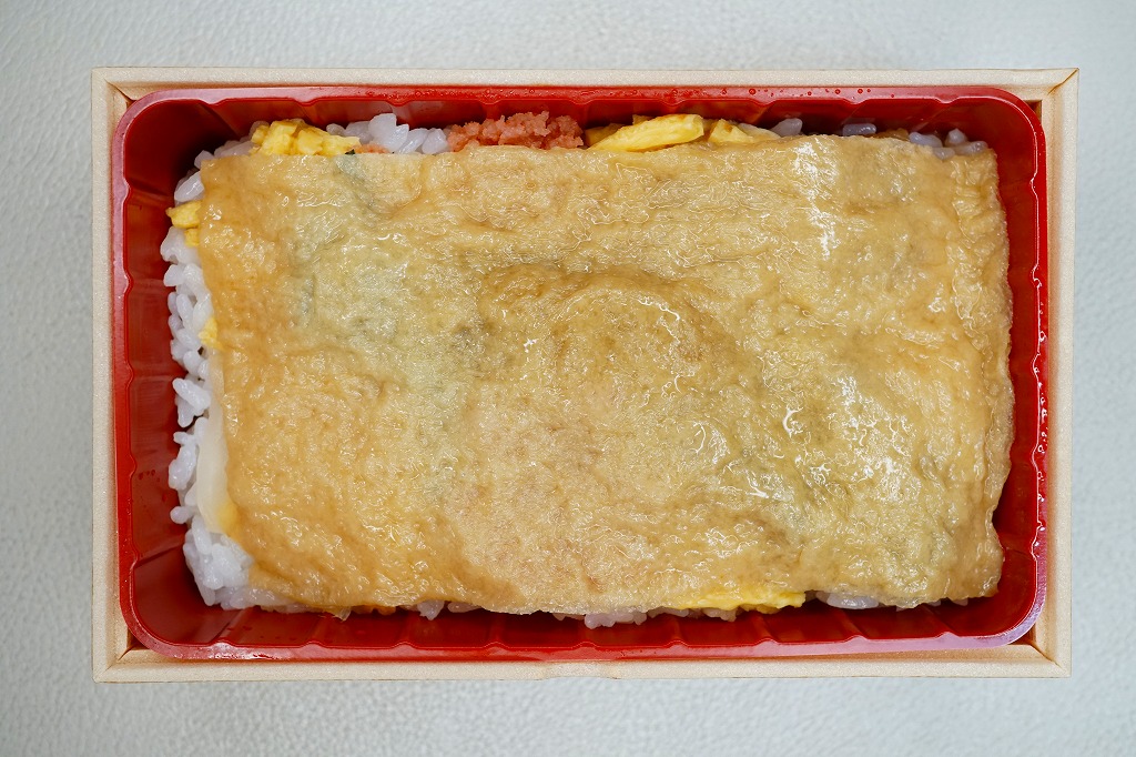商品名を大きく書いて、中身を知りにくい絵柄のスリーブに収めた長方形の容器を引き出してふたを開けると、酢飯を油揚げで覆った中身が見える。この油揚げをめくると、タコ煮、焼穴子、カキ煮、でんぶ、錦糸卵、ガリなどの具が出現。これは東京で評判となった新潟の駅弁「えび千両ちらし」と同じ演出で、何年か後には大阪で評判の駅弁となれるだろうか。油揚げのおかげで出汁の水気と風味が豊かな、柔らかい味のお弁当。価格は2022年の発売時で1,200円、2025年時点で1,300円。