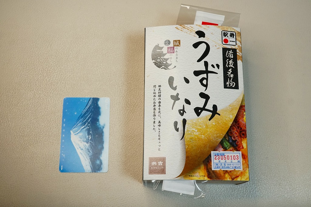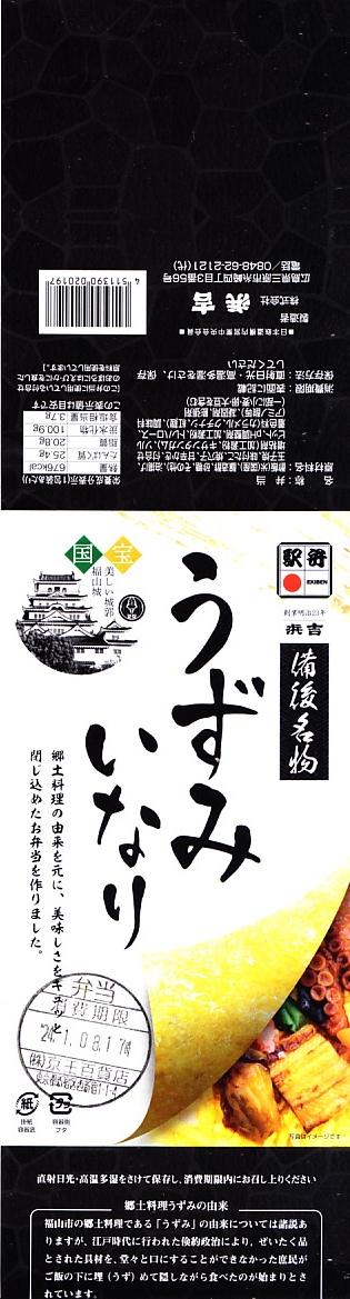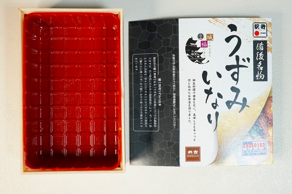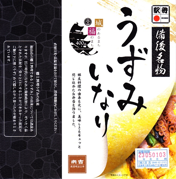 福山城築城400年を記念して、2022(令和4)年9月2日に福山駅で発売。福山の郷土料理にちなんで、一風変わったいなり寿司を作ってみたのだという。スリーブには福山市役所が2022年度に実施した、福山城築城400年記念事業のロゴマークを掲載。
