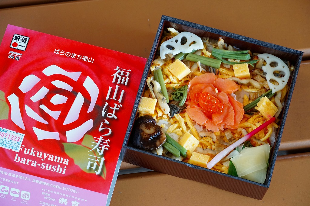 ※2025年9月補訂:写真を更新し解説文を手直し上記の駅弁「福山ばら寿司」の、2004(平成16)年時点での姿。売り場での見た目は、上記の2025年のものと変わらないようにみえる。当時のスリーブは中身が少し見えるよう、バラの花びらの部分がくり抜かれていたほか、中身でバラを象った魚の身がサーモンでなく小鯛の酢漬けだった。