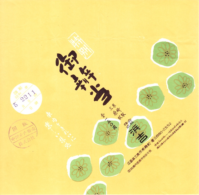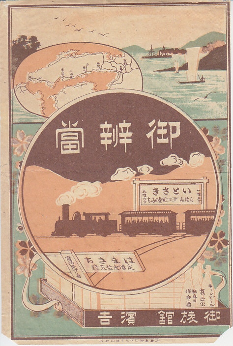 1910年代のものと思われる、昔の糸崎駅弁の掛紙。汽車と駅名標、キロポストっぽく調製元と価格と連絡先、背景に瀬戸内海の風景と鉄道路線図を描いた。調製元の浜吉(はまきち)は、のちに旅館や下関駅などでの営業をやめたものの、今も糸崎駅の駅前で駅弁を作り、福山駅などで販売している。