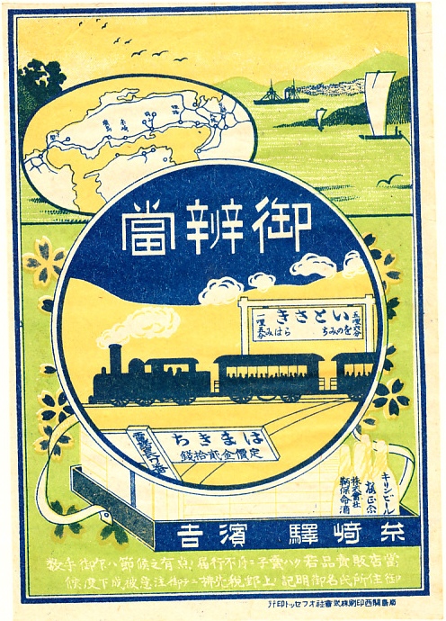 おそらく1920年代の調製と思われる、昔の糸崎駅弁の掛紙。島並と帆掛船の瀬戸内海を背景に、路線図と駅名標に汽車と駅弁立売の箱を描く、鉄道らしい、糸崎らしい絵柄を持つ。