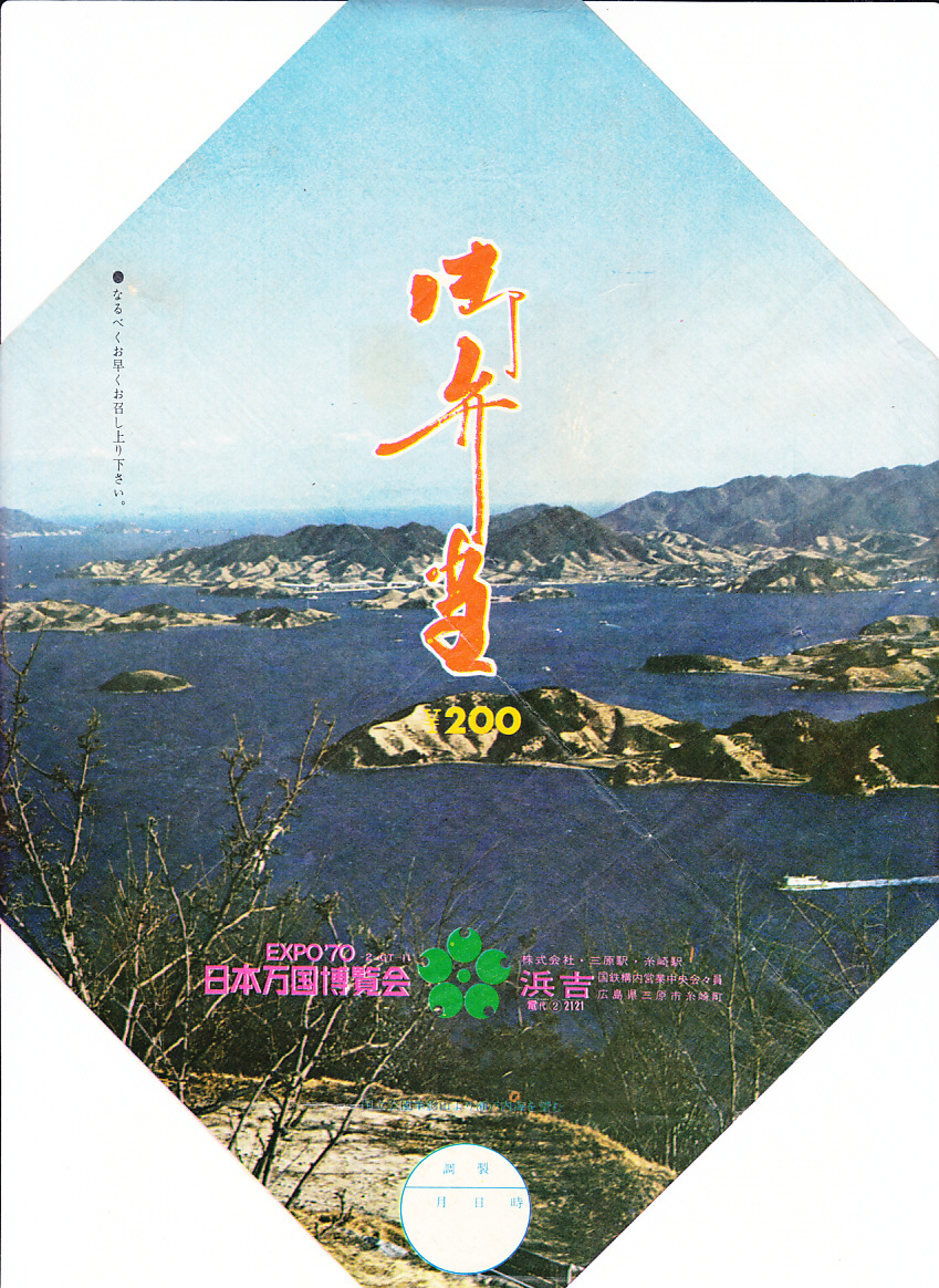 1970(昭和45)年に使用されたのではないかと思われる、昔の三原駅弁の掛紙。同年の大阪万博の文字とロゴを記し、瀬戸内海国立公園の写真を使う。今から見れば、山や島の斜面が削られた傷跡が痛々しい。この地域ではこの頃まで、温州みかん畑が盛んに造成されたが、豊作と過剰生産にグレープフルーツやオレンジの輸入自由化でみかんの価格が暴落し、畑が放置されるようになる。