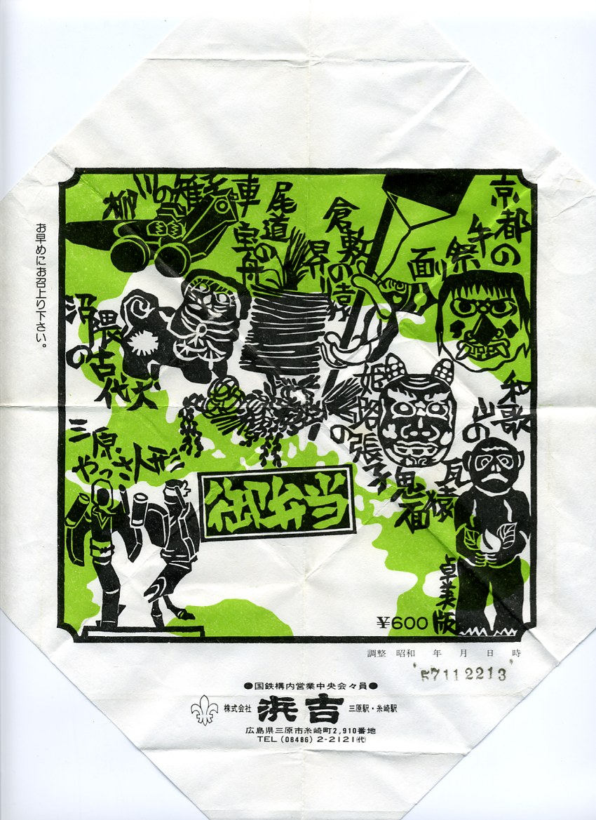 1982(昭和57)年11月22日13時の調製と思われる、昔の三原駅弁の掛紙。山陽エリアを主とした郷土玩具の各種を版画風に描いているが、その中には聞いたことがないものも少なくない。どういう基準でどうやってこれらをリストアップしたのかが興味深い。