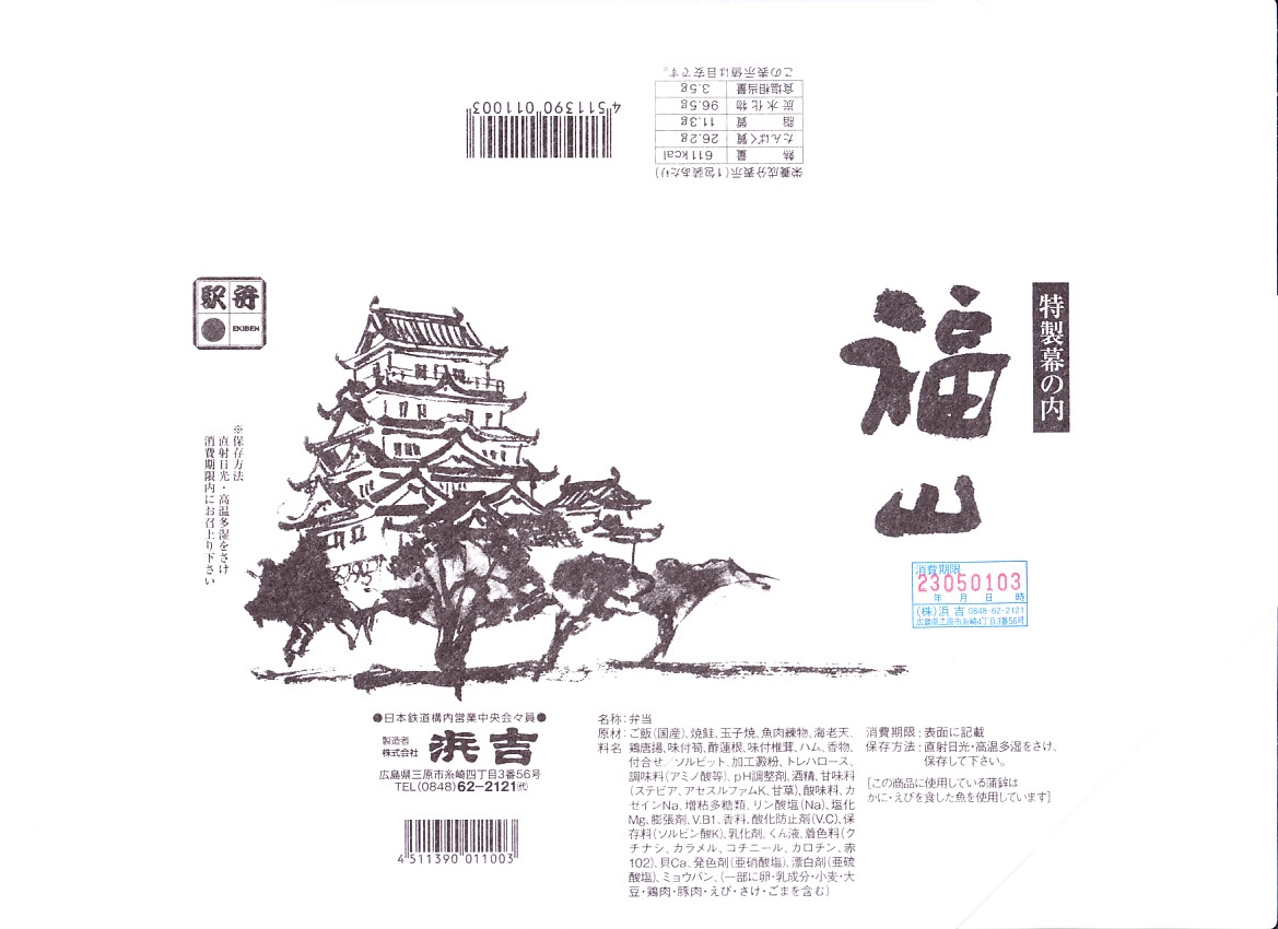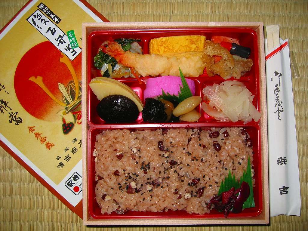 中身はつまり、上等幕の内駅弁。幕の内駅弁の容器としては細長く深めにできている折箱の、半分に日の丸御飯を詰め、半分に焼鮭、かまぼこ、玉子焼、海老天、鶏唐揚、煮物、ハム、小女子、香の物を折り重ねる。名前と掛紙の絵柄を除き、上記の福山駅弁「特製幕の内福山」と、まったく同じ。時系列的にはこちらが先で、あちらへ流用されたもの。価格は2010年時点で1,050円、2014年時点で1,100円、2023年5月から1,250円。
