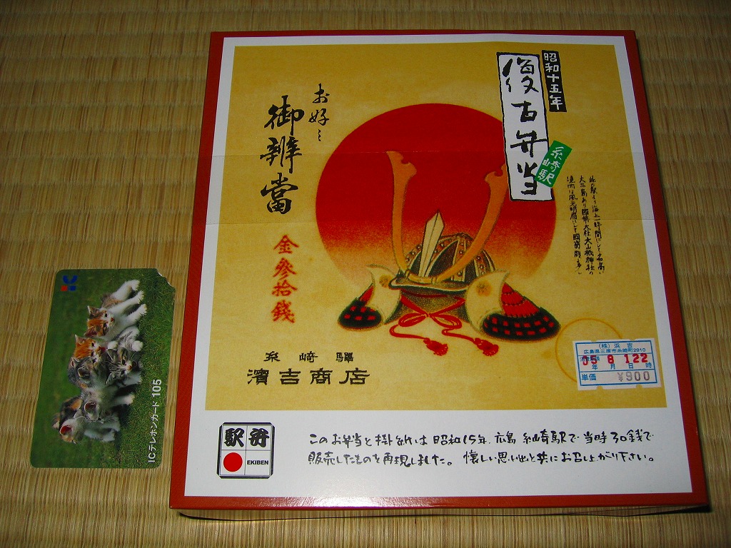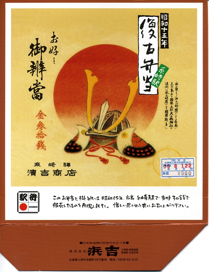 少なくとも2004(平成16)年までには発売。赤いトレーを入れた正方形の容器に、戦前の糸崎駅の駅弁掛紙を印刷した掛紙代わりのボール紙のふたをして、プラスティックの帯で留める。1940(昭和15)年の糸崎駅弁を再現したという中身は、赤飯に海老フライ・蒲鉾・玉子焼・ママカリ・鳥唐揚・焼鮭・昆布巻・煮物各種・煮豆など。海老と唐揚を除き品質の良さを感じるし、見栄えも整っている。