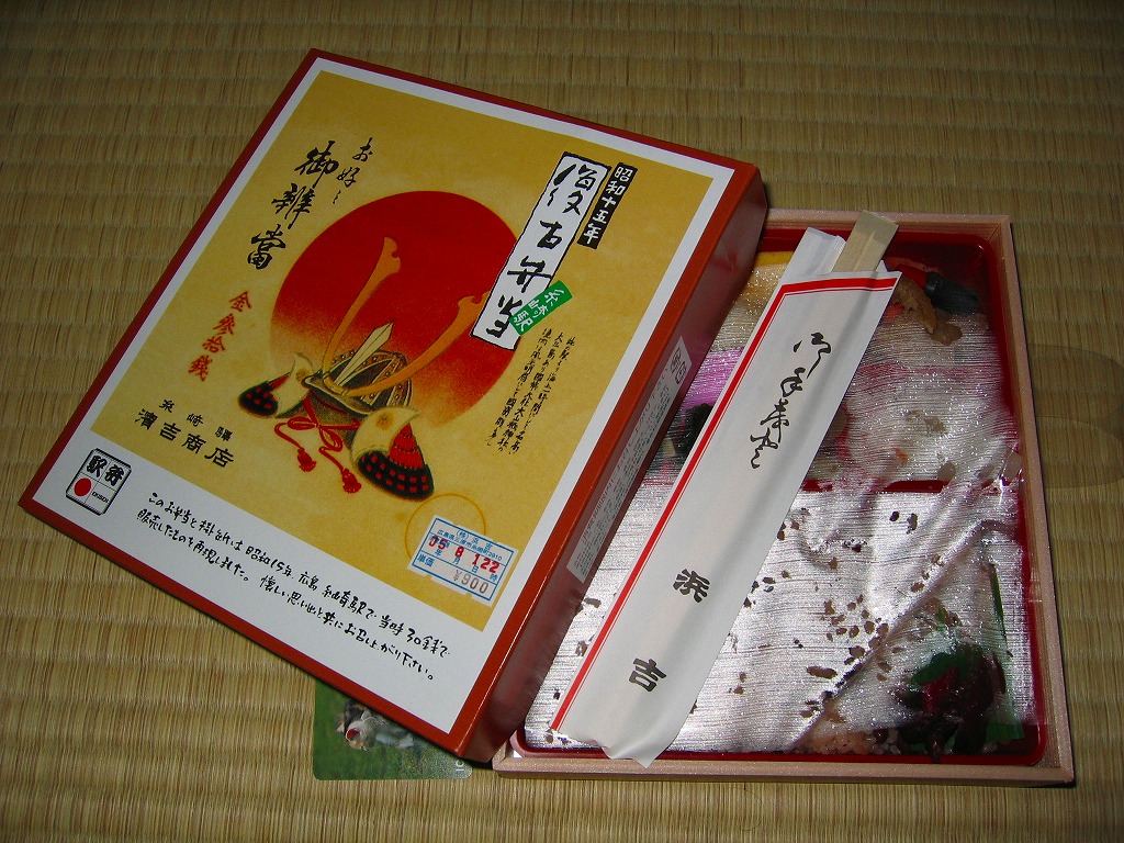 同じコンセプトの駅弁を東京で出せばマスコミが飛び付くだろうが、ここのものはいまだに完全な無名であり、もったいない。この駅弁は福山駅で買えたが、糸崎駅ではおそらく買えず、三原駅に置かれるかどうかは、分からない。購入時は900円、2008年6月から950円、2014年時点で980円。2014年頃までの販売か。