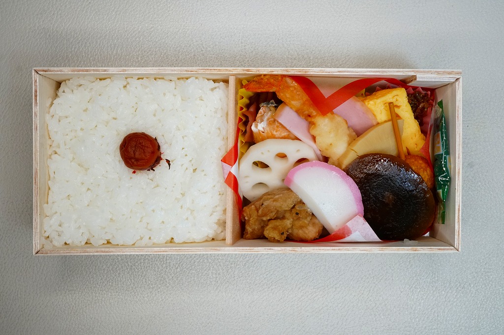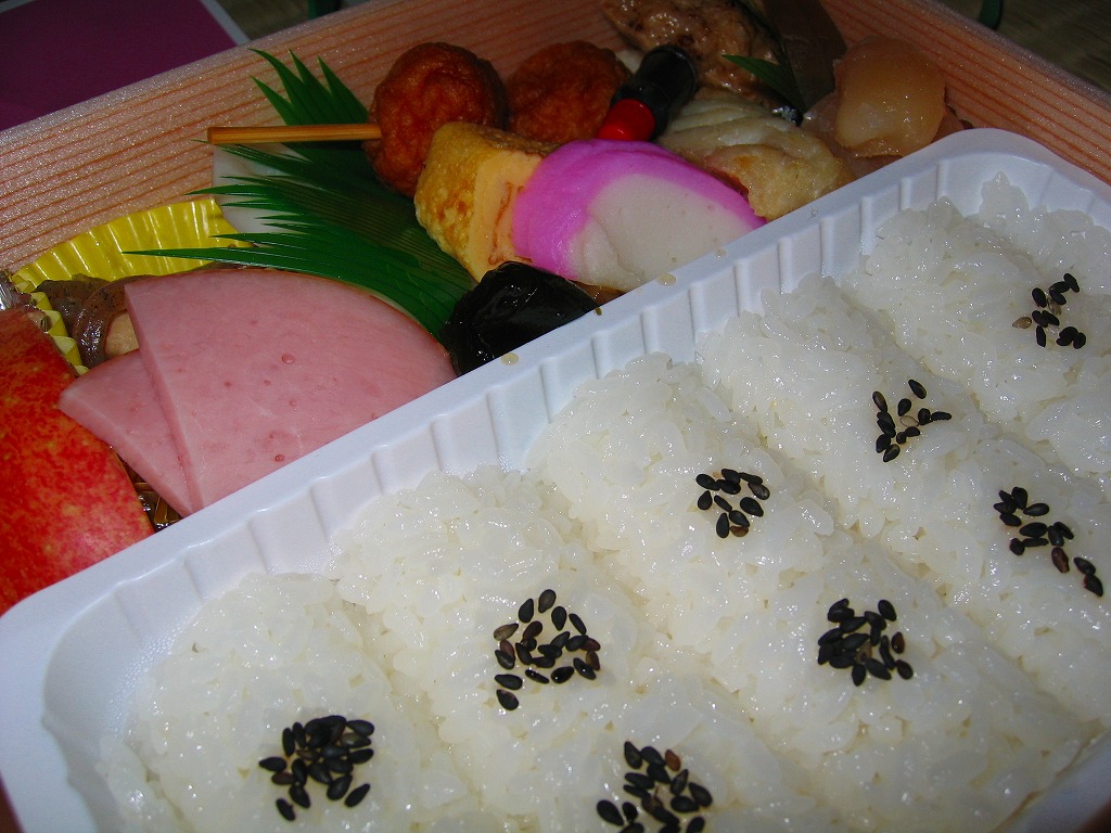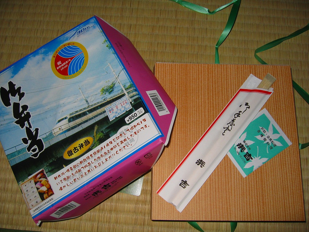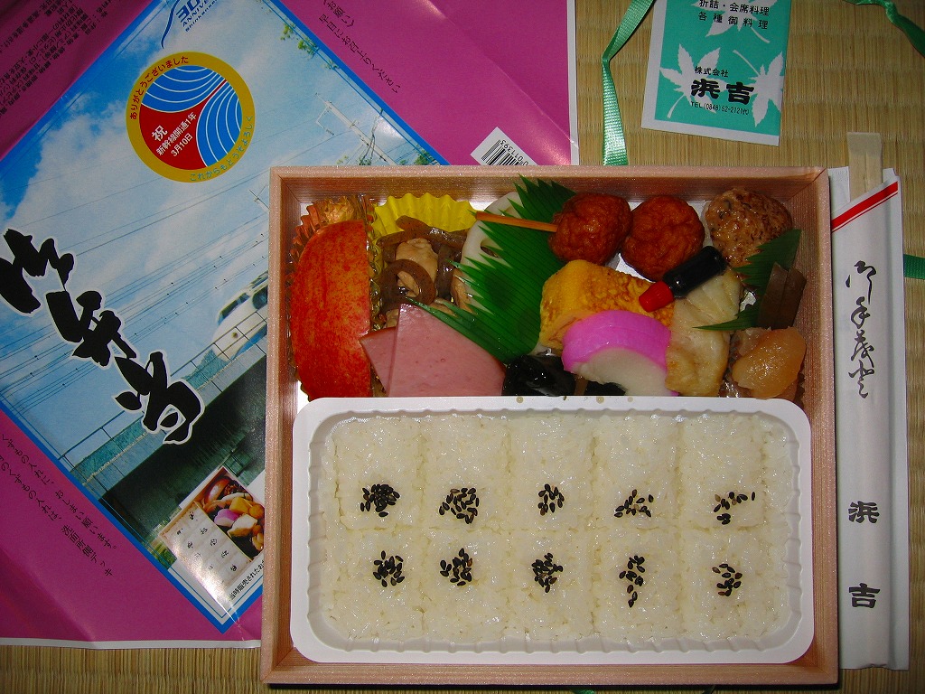 正方形に近い容器に木目調の紙のふたをかけて割りばしと紙ナプキンを載せ、当時の駅弁掛紙から転用した丸顔新幹線の写真を載せた掛紙で包み、ビニールひもでしばる。中身は型押し俵飯に白身魚、蒲鉾に串蒲鉾、玉子焼、ハム、煮物数点にリンゴなど。そういえば昔のお弁当には、こんなハムが入っていたような。