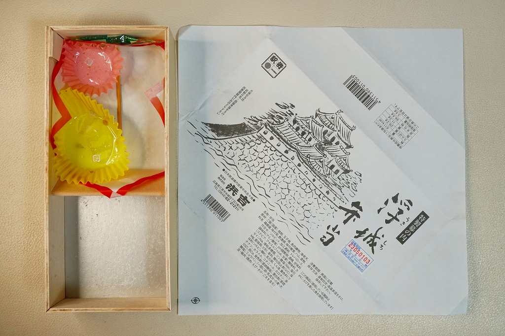 2003年に三原駅の駅弁屋が福山駅へ進出してから、ほどなく発売か。底が深い長方形の経木枠の容器に木目柄のボール紙でふたをして、福山城を描いた単色の掛紙をかけて、ビニールひもでしばる。中身は日の丸御飯に焼鮭・蒲鉾・玉子焼とエビフライ、練り団子、鶏肉、椎茸、ハムなどのおかず。つまり幕の内駅弁で、中身に特段の豪華さは無いはずが、詰め方と見せ方で、まるで正月の記念駅弁のような印象。価格は2005年時点で1,050円、2015年時点で1,100円、2023年5月から1,250円。