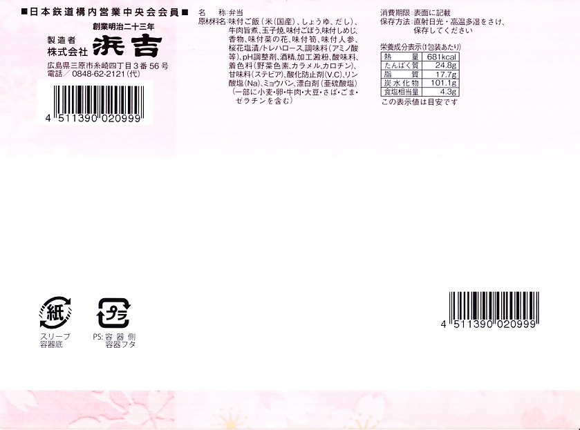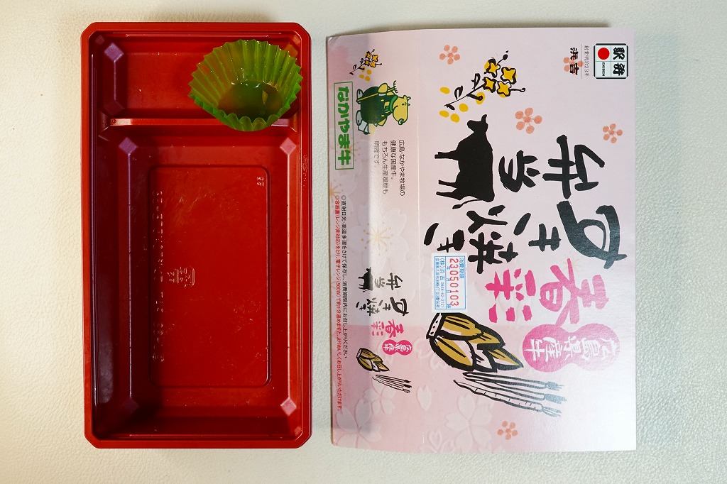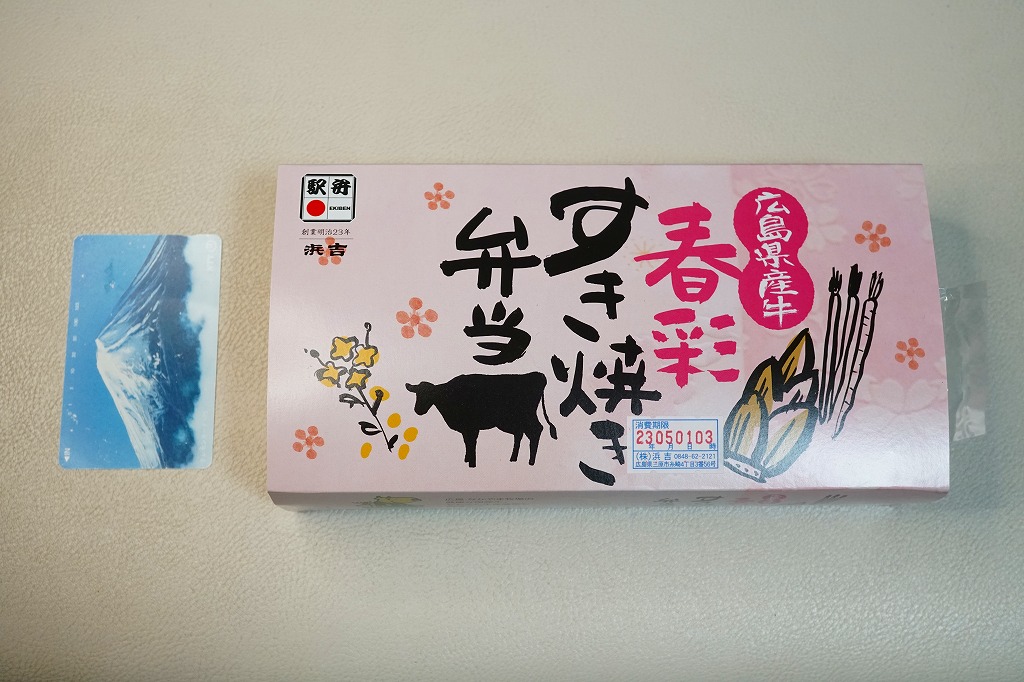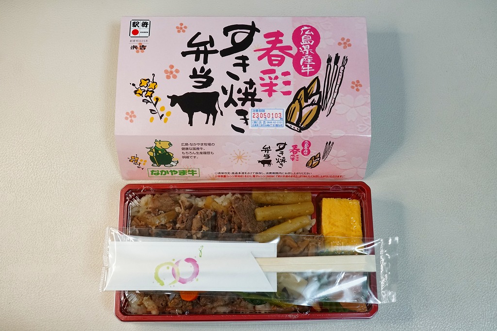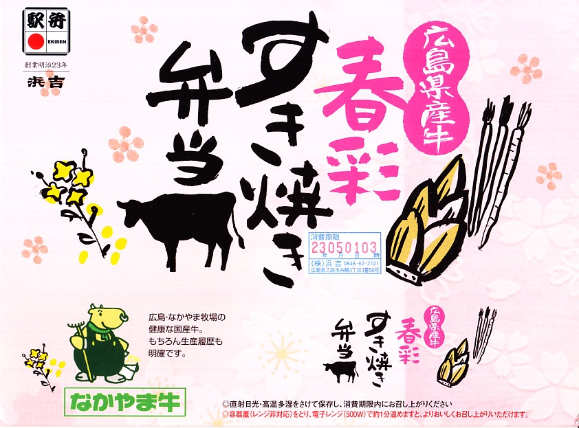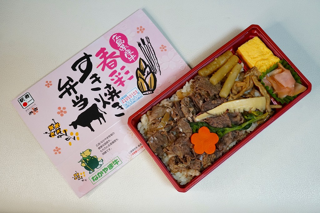 2015(平成27)年までに発売か。12月または1月から6月までの販売とされ、それ以外の期間は「松茸牛すき弁当」となる。長方形の容器に味付ご飯を詰め、広島県産牛の、広島県福山の畜産業者のブランド牛「なかやま牛」の旨煮で覆い、ごぼう、しめじ、たけのこ、にんじん、菜の花で彩り、玉子焼とガリを添える。高めの値段の割に牛肉が赤身がちで固めなのは、このブランド牛の特徴なのか、そんな味を狙ったのか。おかずにも、あるいはおつまみに向くかもしれない、B級感のある牛肉駅弁。タケノコと菜の花で、春なのだと思う。価格は2015年時点で1,100円、2017年時点で1,130円、2019年時点で1,200円、2023年時点で1,250円、同年5月から1,400円。